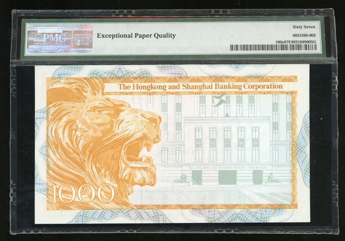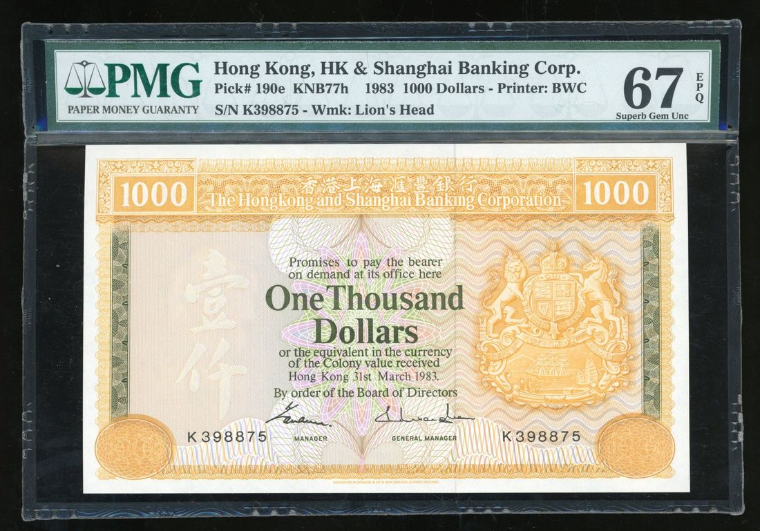 HongKong & Shanghai Banking Corporation, $1000, 31.3.1983, serial number K398875, (Pick 190e), PMG 67EPQ. Though the more common type but nonetheless an impressive high grade example