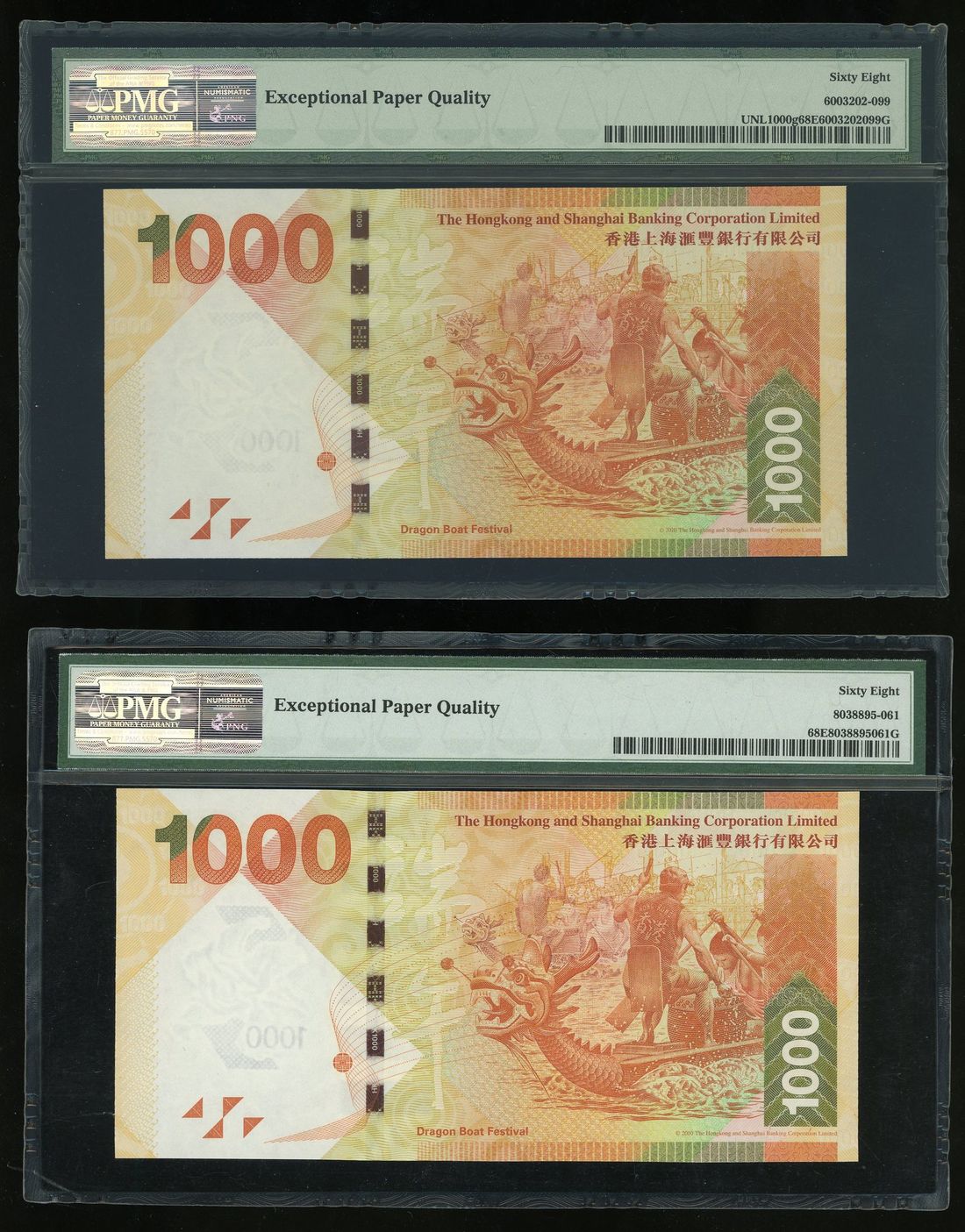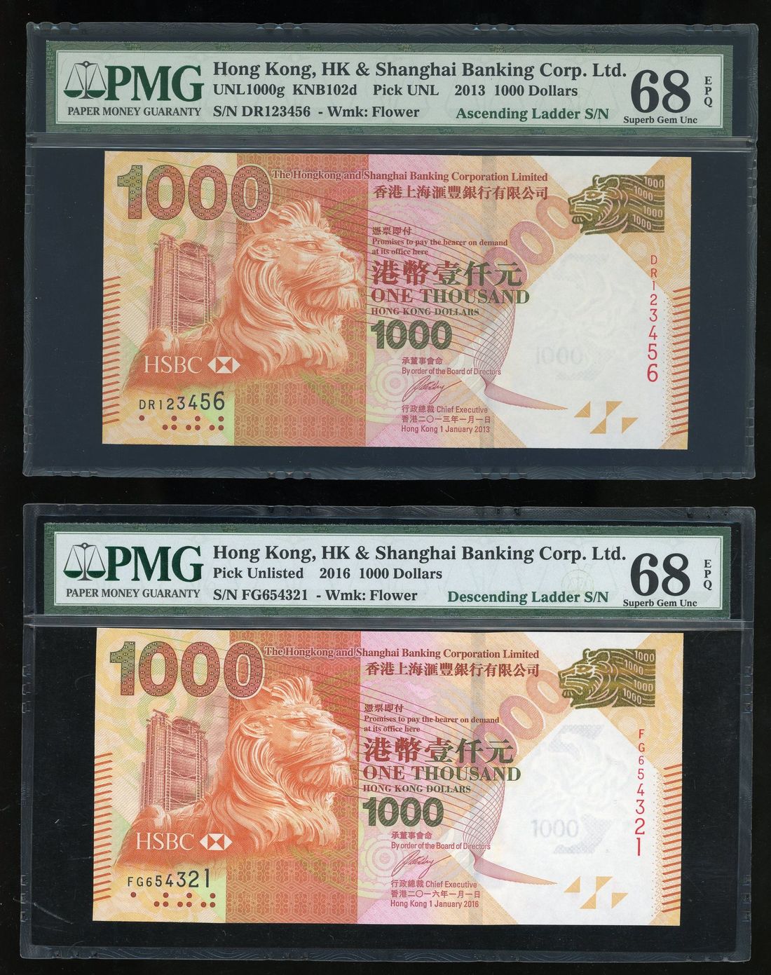 HongKong & Shanghai Banking Corporation, a pair of fancy serial number $1000, 1.1.2013 and 1.1.2016, ascending ladder serial number DR 123456 and descending ladder serial number FG 654321,