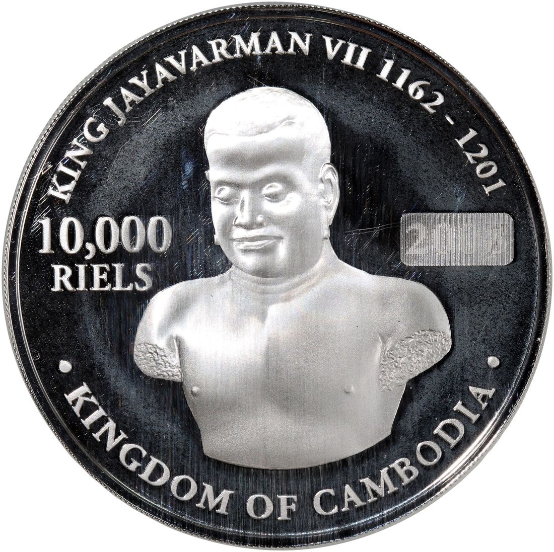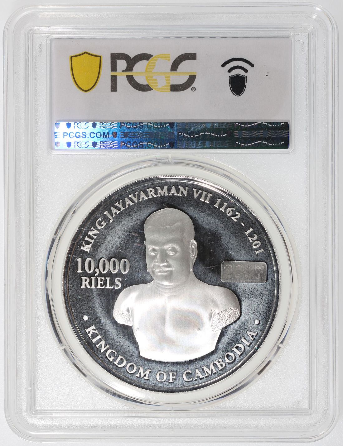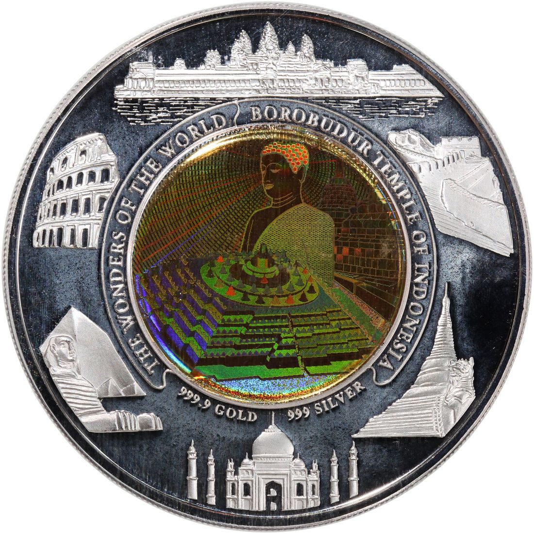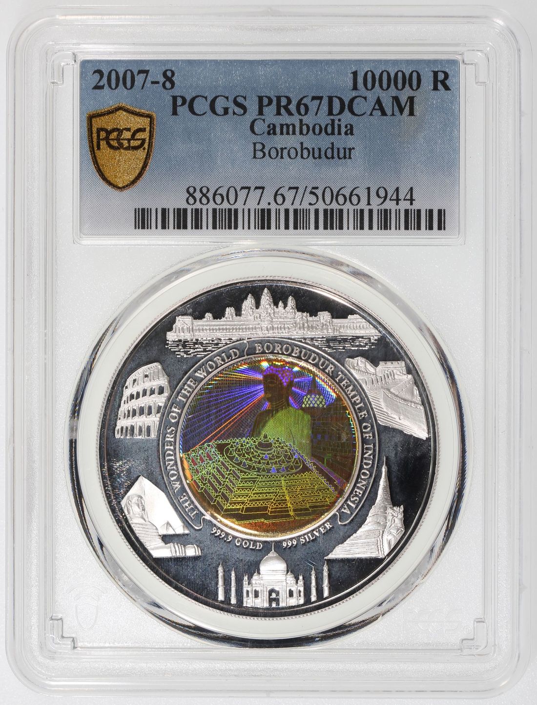 Cambodia, [PCGS PR67DCAM] bi-metal gold and silver 10000 riels, 2007-8, Borobudur Temple, with 3.5gram gold and 31.104gram silver, mintage 3000, centre with hologram effect, with certificate. Cert. 50661944