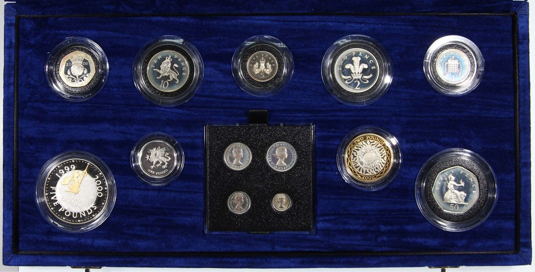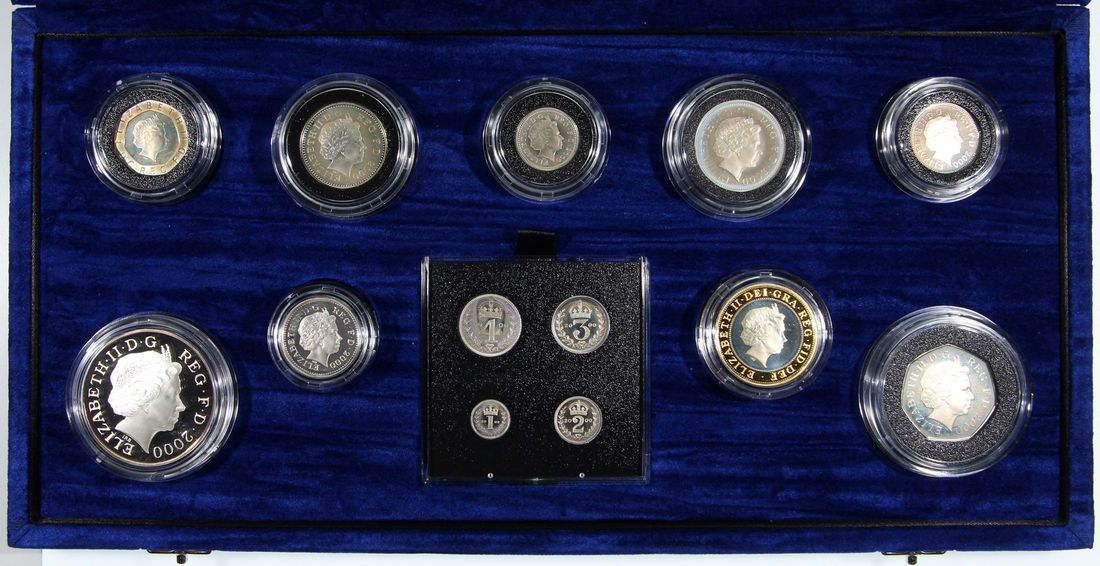 Great Britain, 13 coin millennium silver proof set, 2000, including the Millennium £5 and 4x Maundy coins, Uncirculated, pennies are oxidised, with original presentation case and certificate of issue