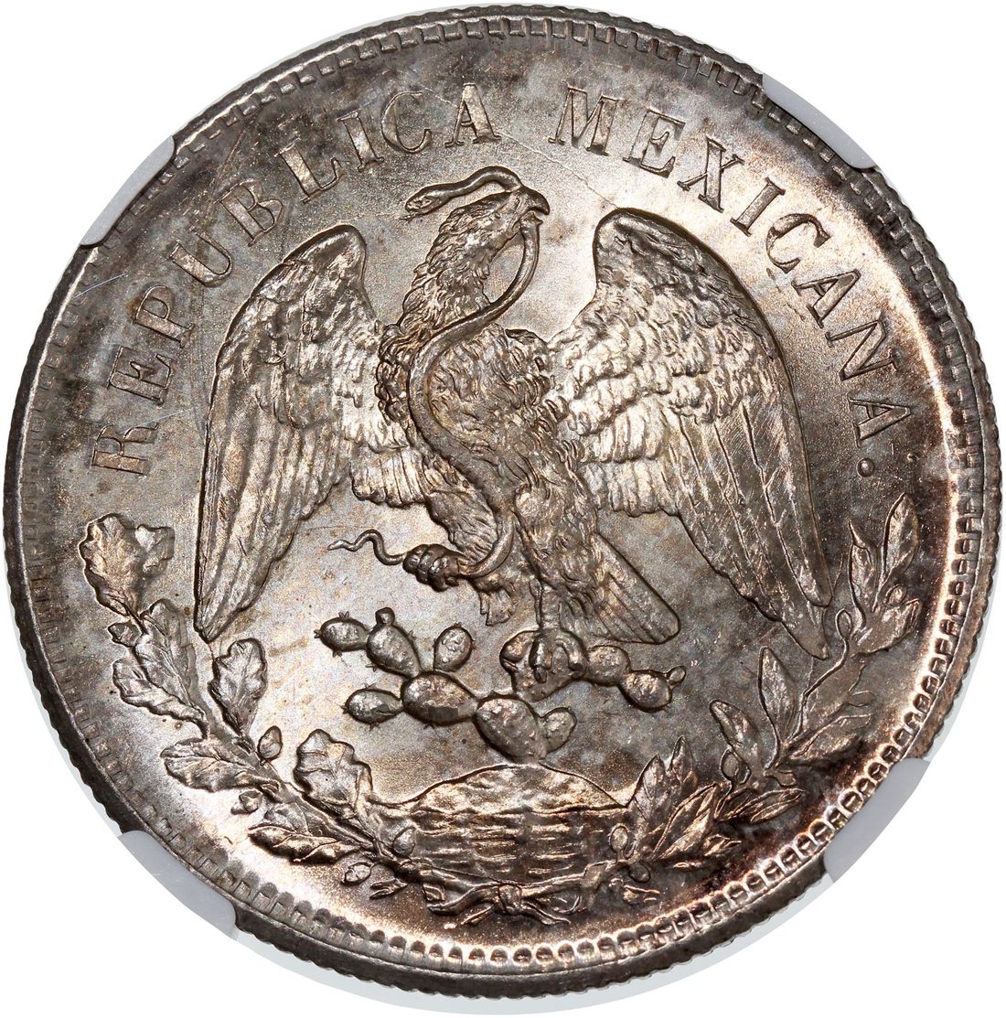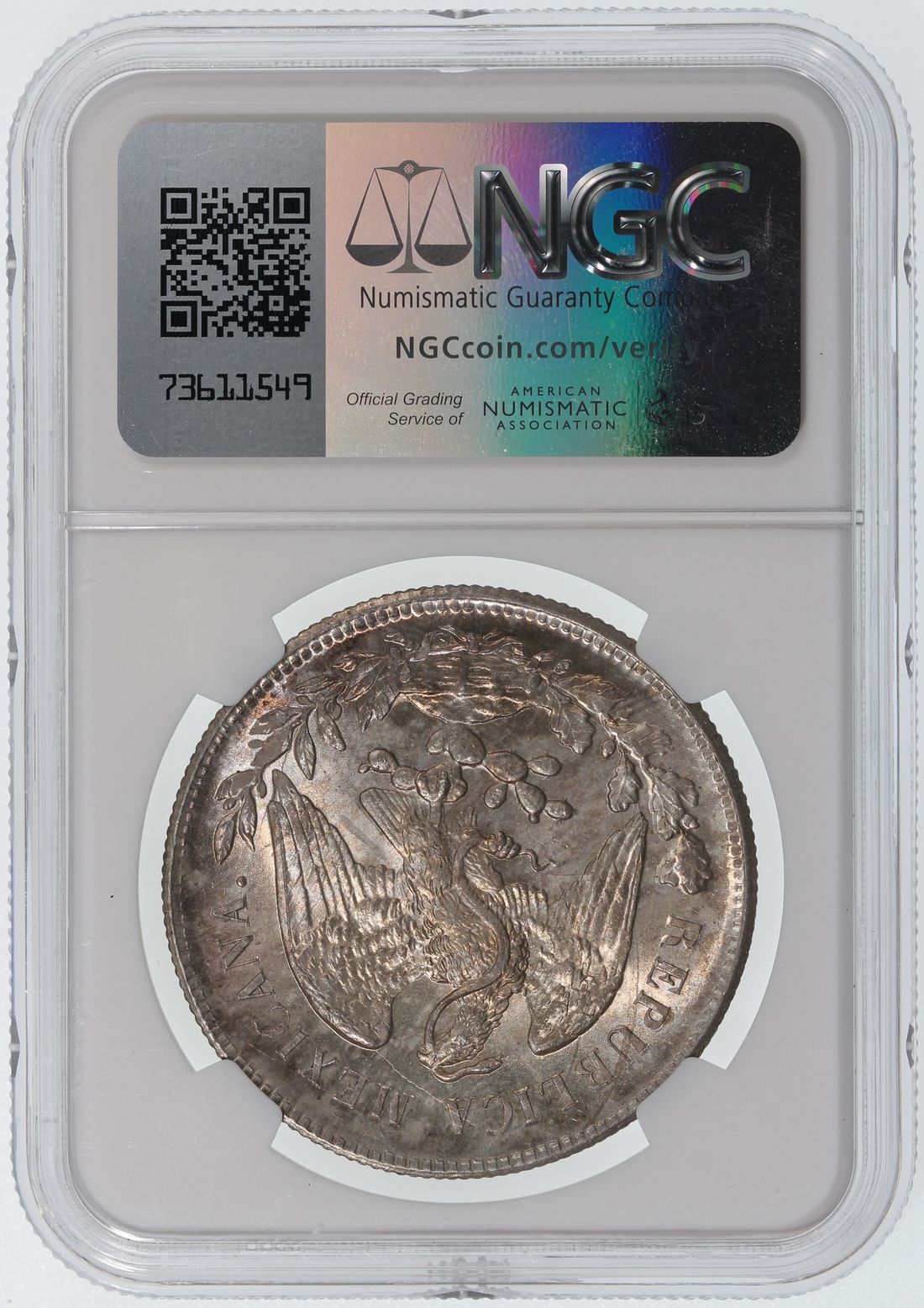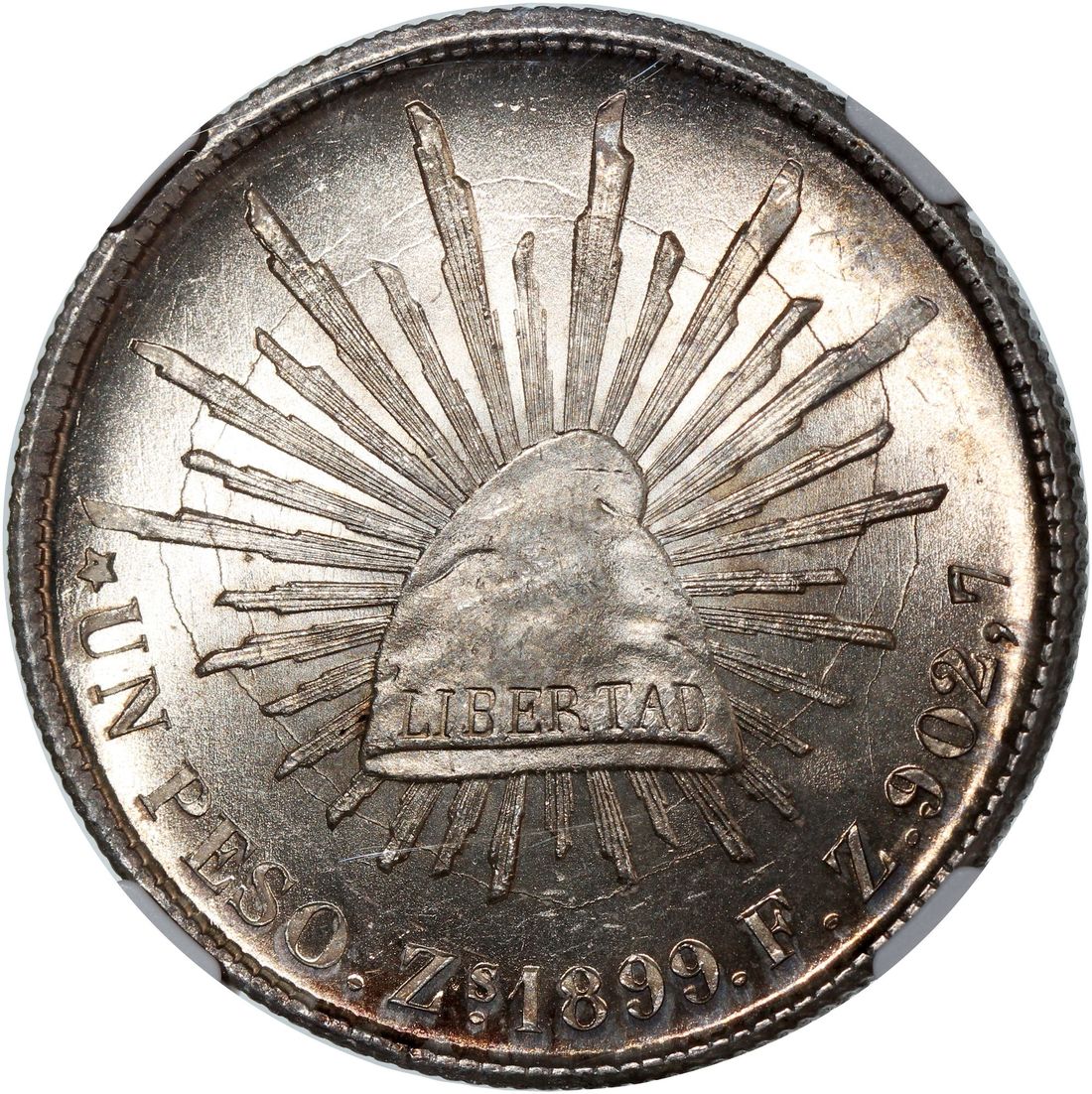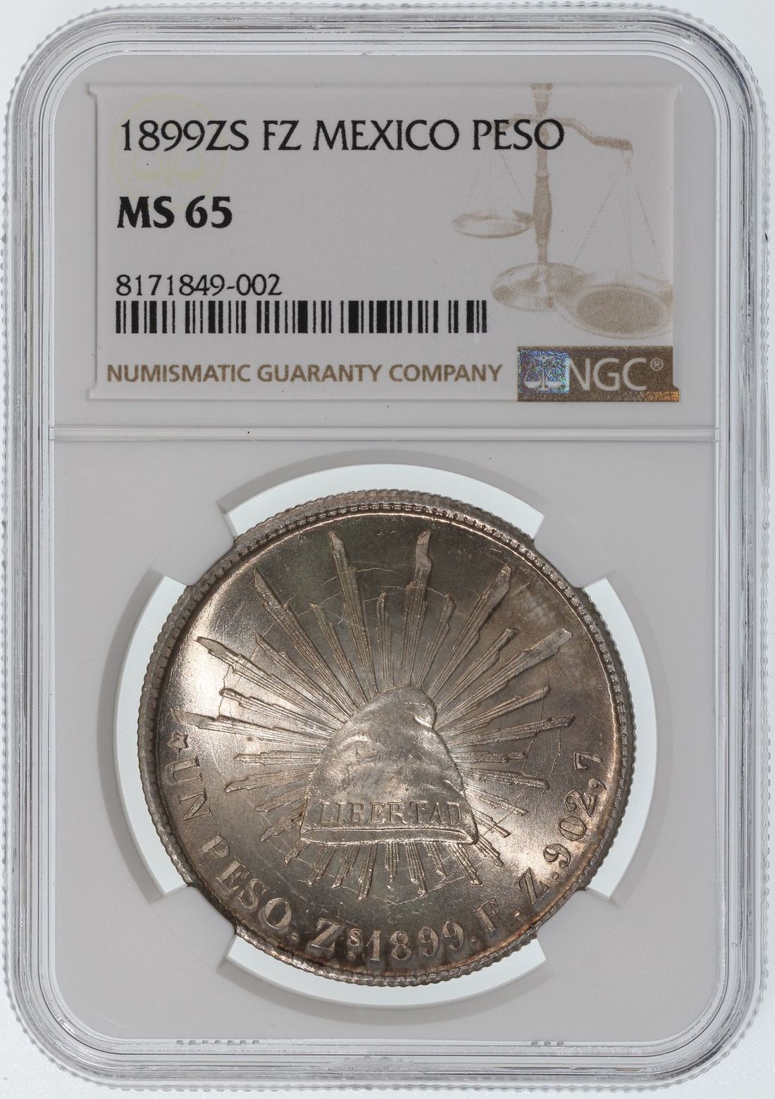 Mexico, [NGC MS65] silver peso, 1899-ZS FZ, Zacatecas Mint, (KM-409.3) #8171849-002. Obverse with cartwheel luster and reverse with sunset tones throughout. NGC census 2nd highest grade with only 1 better examples