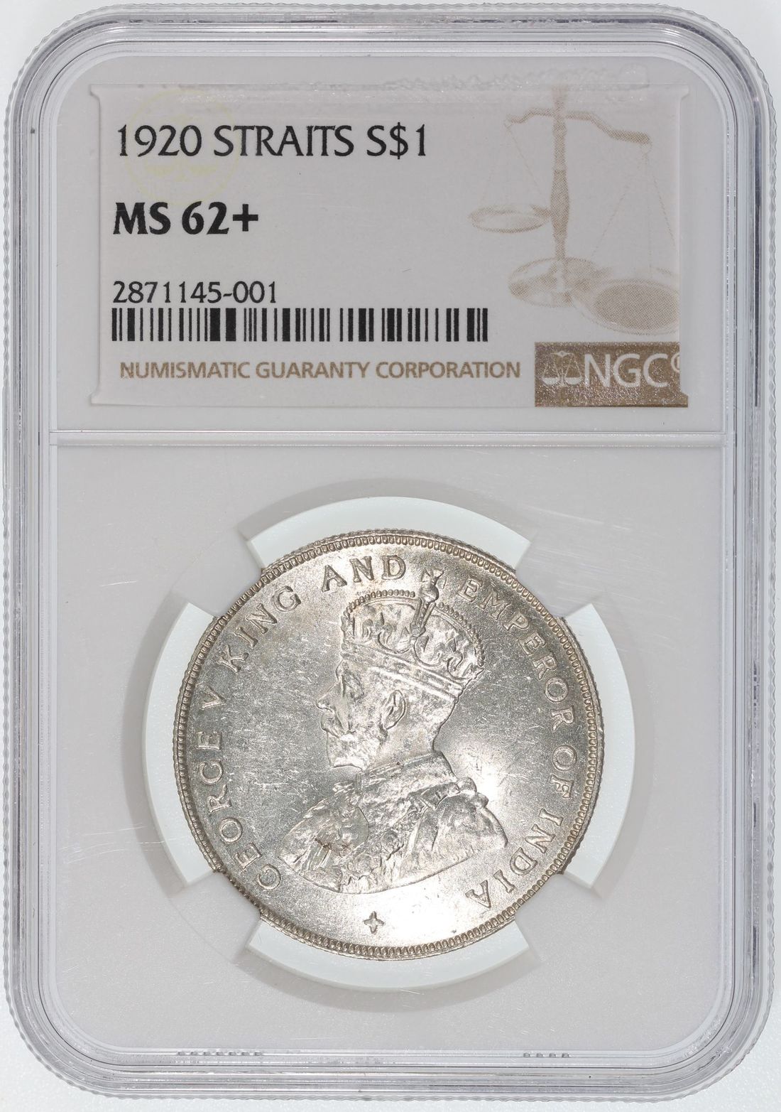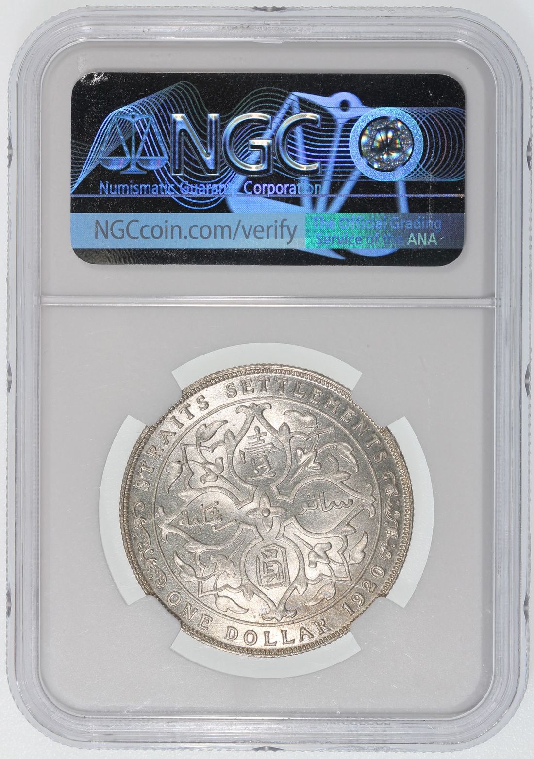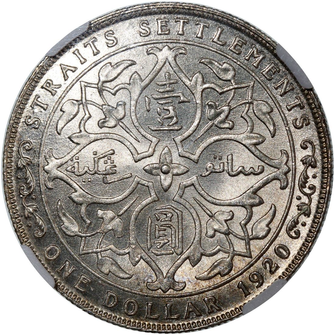 Straits Settlements, [NGC MS62+] silver dollar, 1920, George V, Cert.# 2871145-001