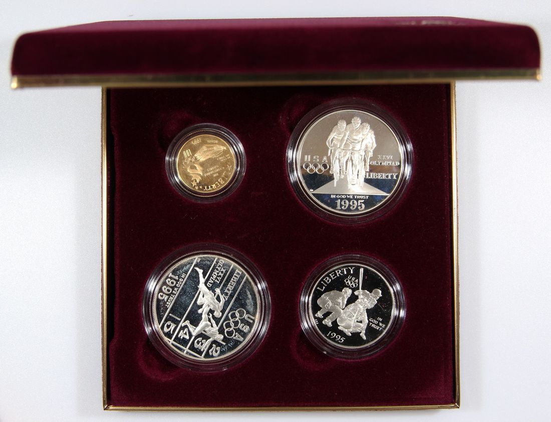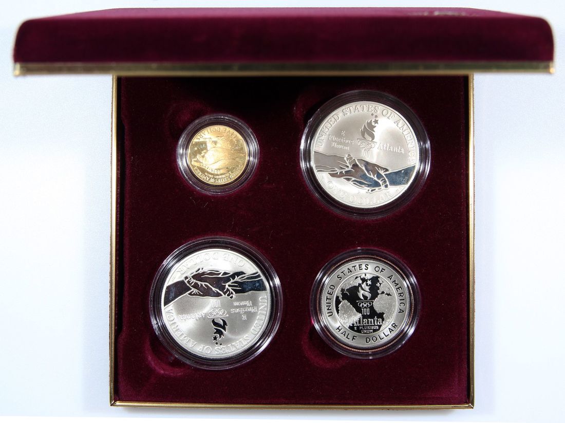 United States, a proof set of 4x, including: gold $5, silver $1 (2) and copper nickel $½, Atlanta Centennial Olympic Games commemorative issue, 'Olympic Stadium', 'Track Runner', 'Cyclist' and 'Baseball', AGW 0.24oz, ASW 1.52oz, Uncirculated, with original certificate of issue and packaging (1 box of 4)