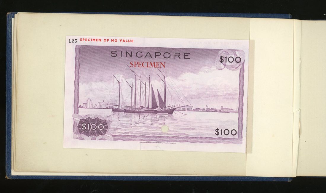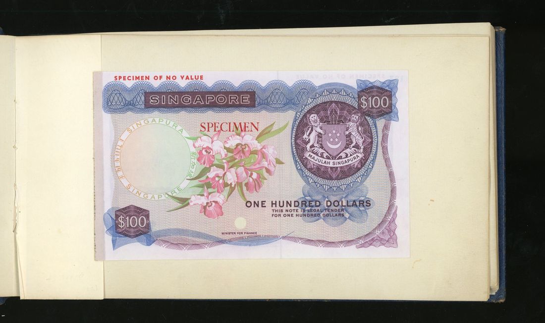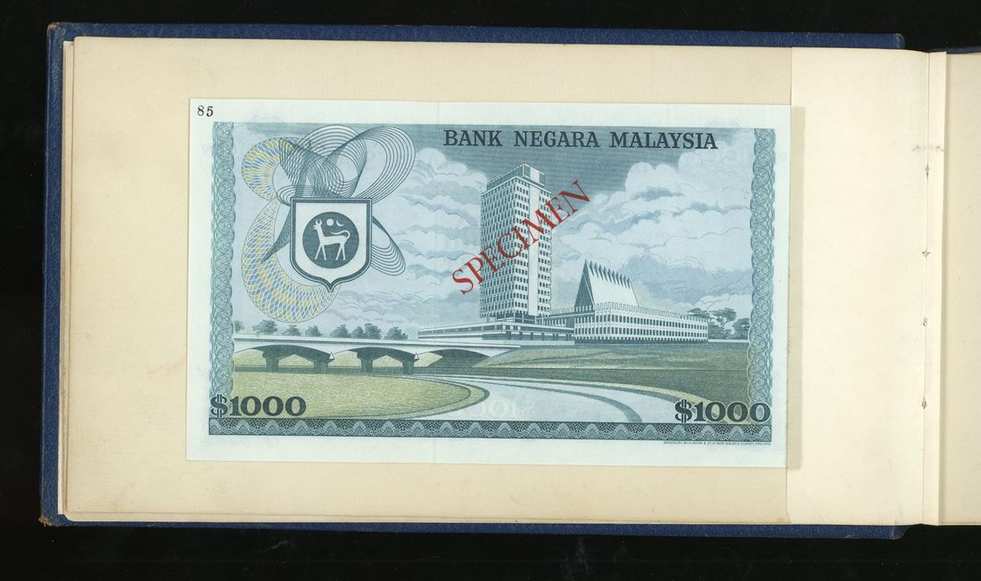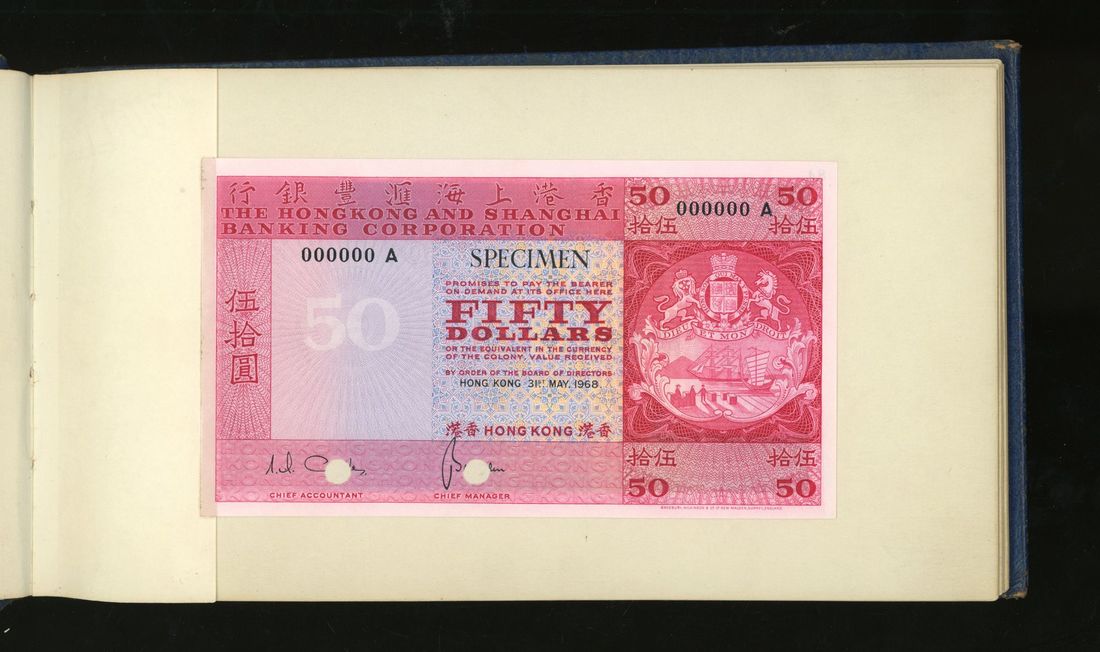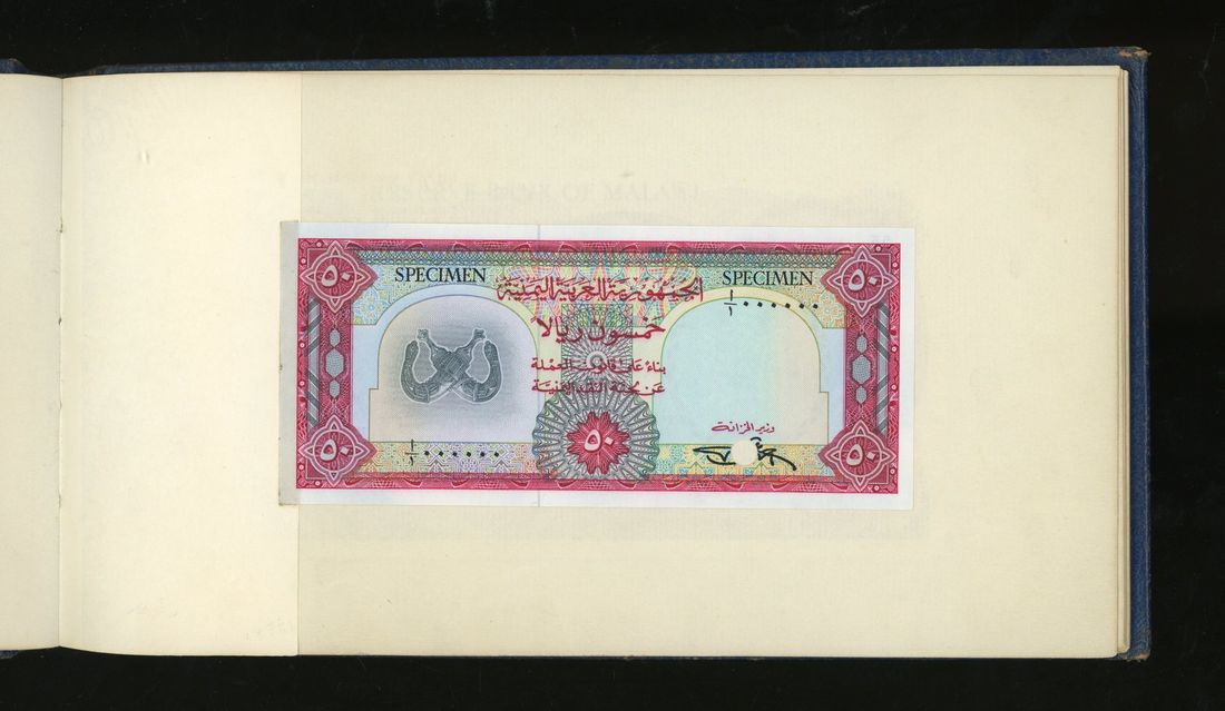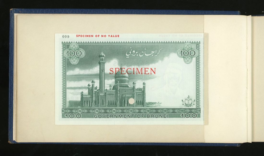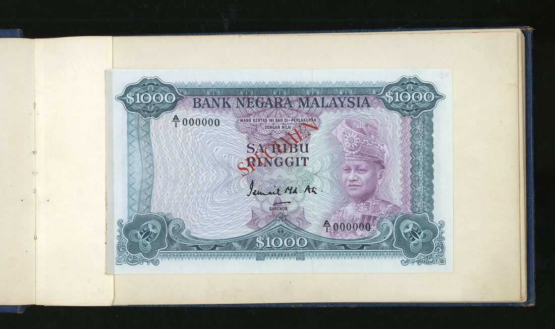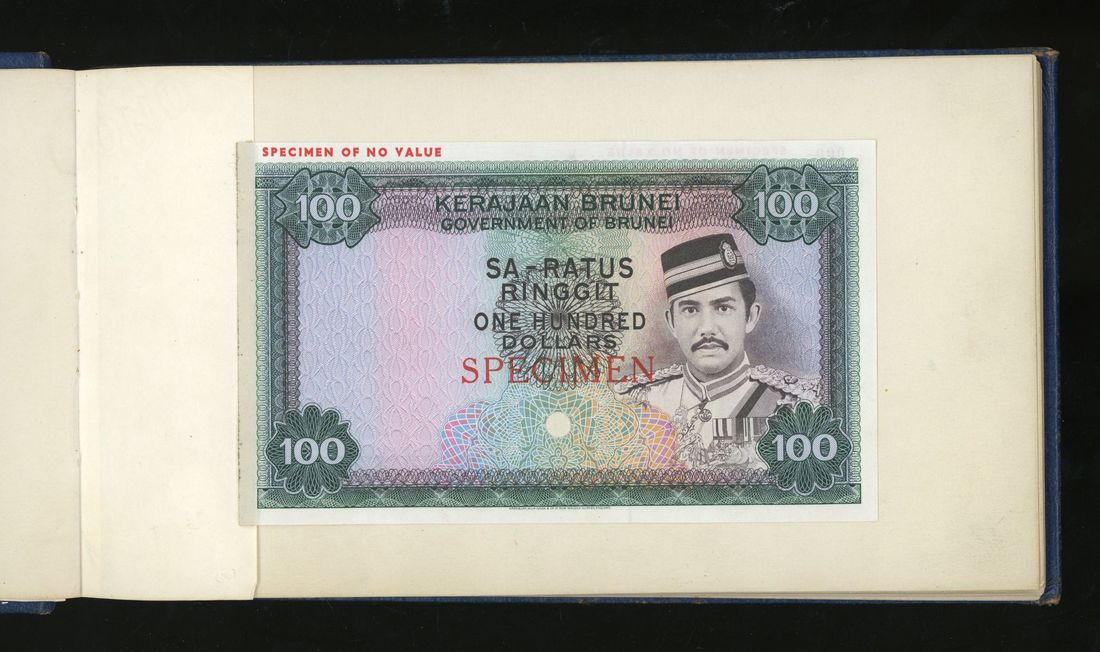 World, an album of 32 countries' colour trial specimen banknotes engraved and printed by Bradbury Wilkinson & Company Limited, consisting of Malaysia 1000 ringgit, ND(1968-72), Singapore $100, ND(1967-73), Brunei $100, 1972-88, 10 rupees, ND(1972), Hong Kong & Shanghai Banking Corporation $50, 1968, Ceylon 100 rupee, 1971, Qatar & Dubai 100 riyals, 1960's and others,