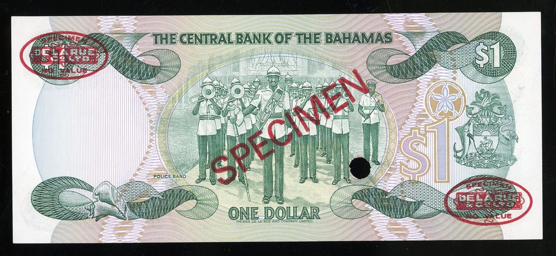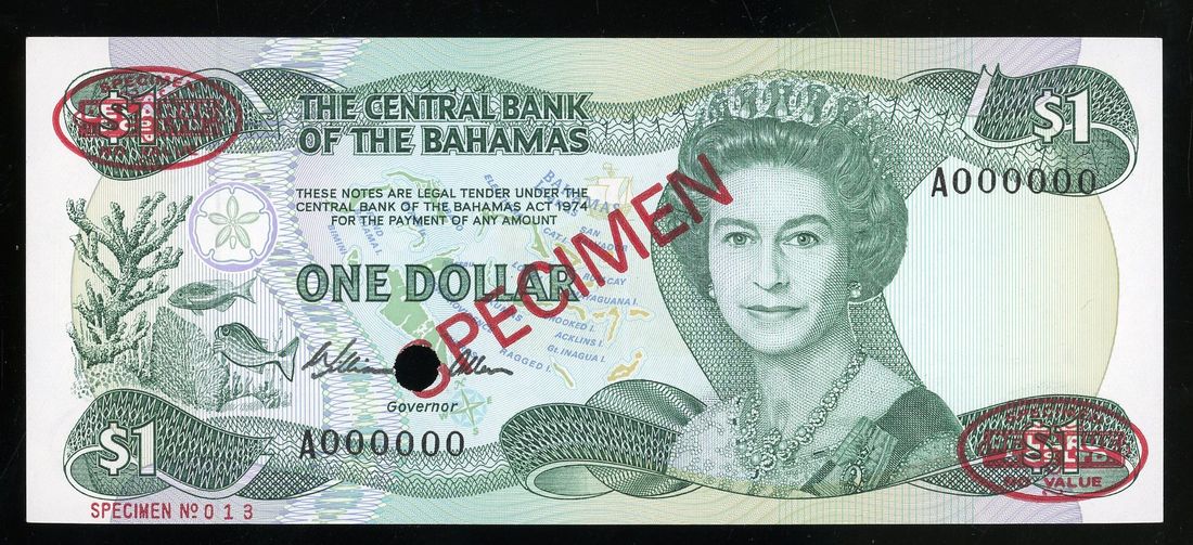 Central Bank of The Bahamas, specimen $1, L.1974 (1984), serial number A000000 013, (Pick 43as), very minor spot reverse, uncirculated. Scarcer type with DLR oval stamps.