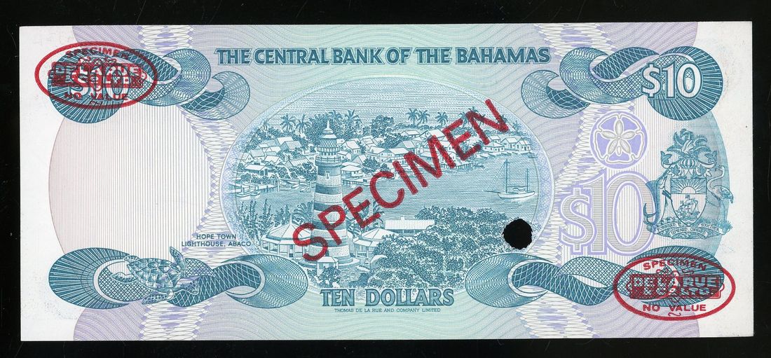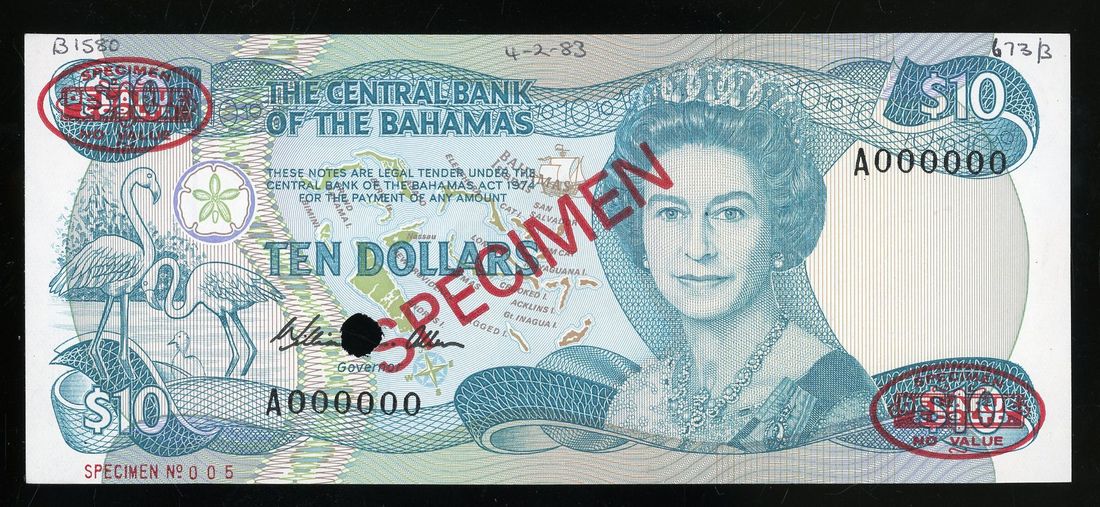 Central Bank of The Bahamas, specimen $10, L.1974 (1984), serial number A000000 005, (Pick 46as), printer's annotation at top right, minor mounting at reverse, about uncirculated. Scarcer type with DLR oval stamps.