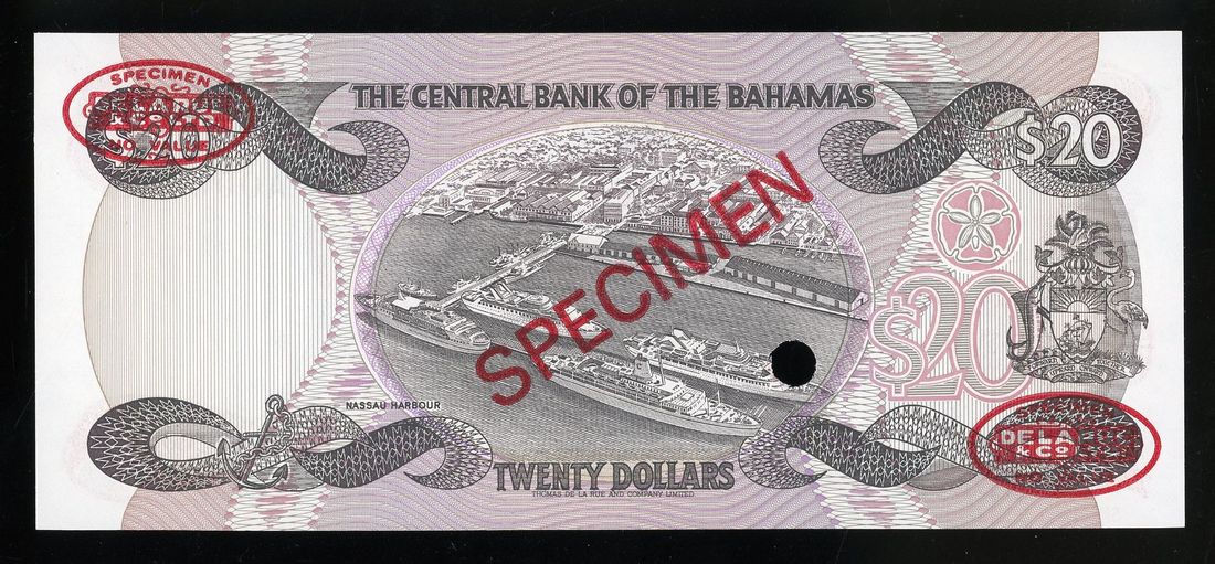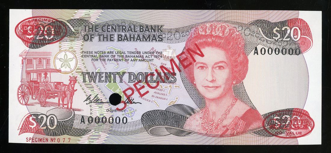 Central Bank of The Bahamas, specimen $50, L.1974 (1992), serial number A000000 077, (Pick 55as), uncirculated. Modern Bahamas DLR specimens rare