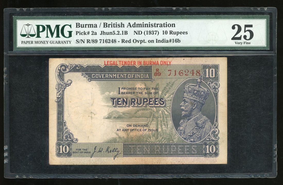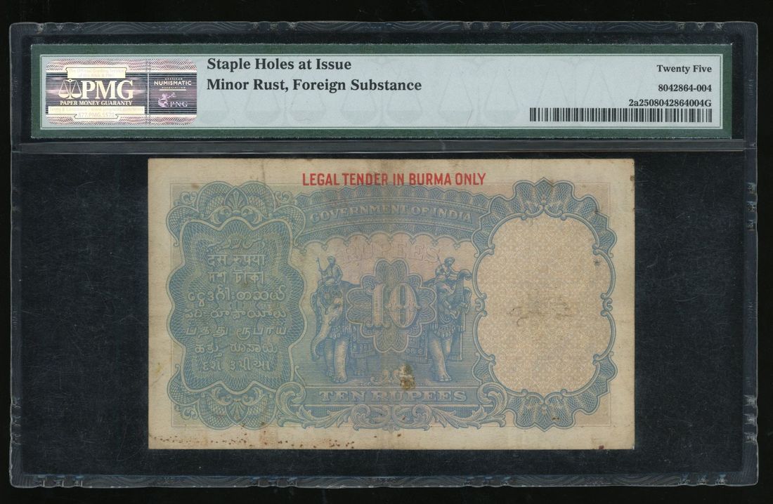 Burma, overprinted on Government of India 10 rupees note, ND (1937), serial number R/89 716248, (Pick 2a), PMG 25, staple holes at issue, minor rust, foreign substance. An early overprint issue