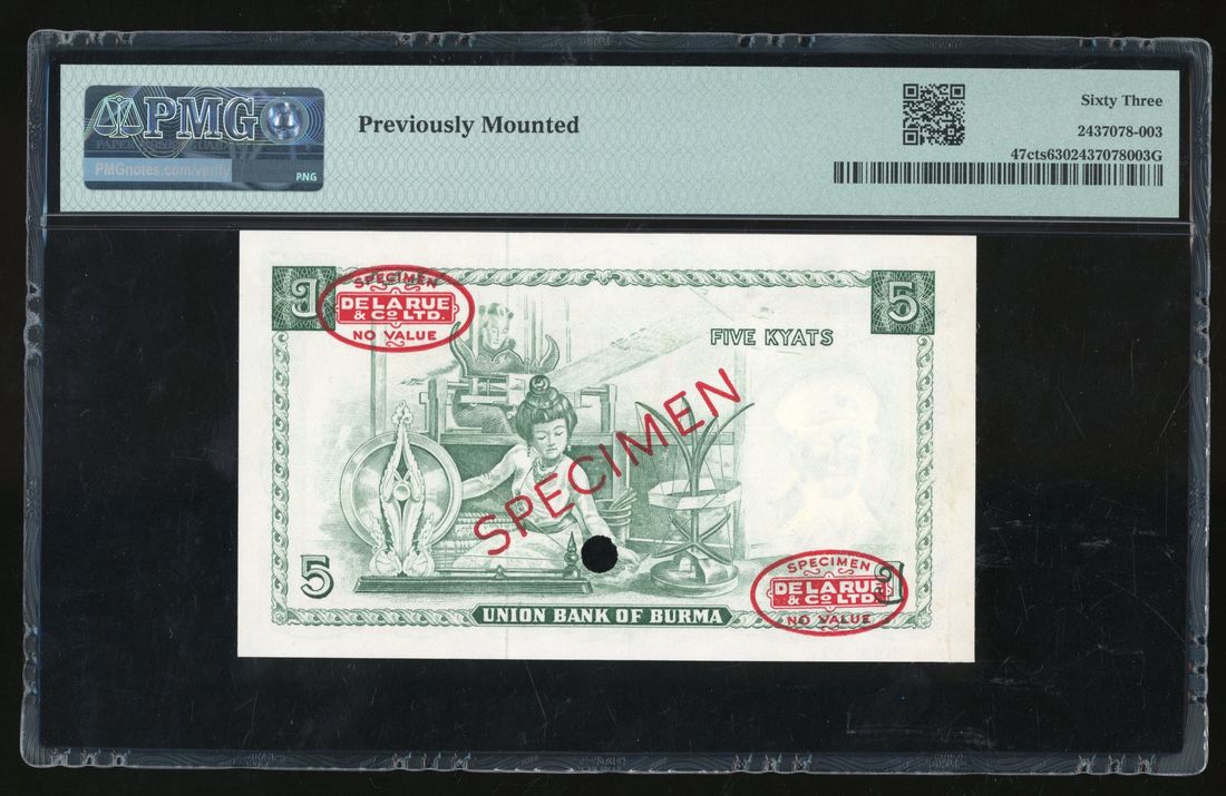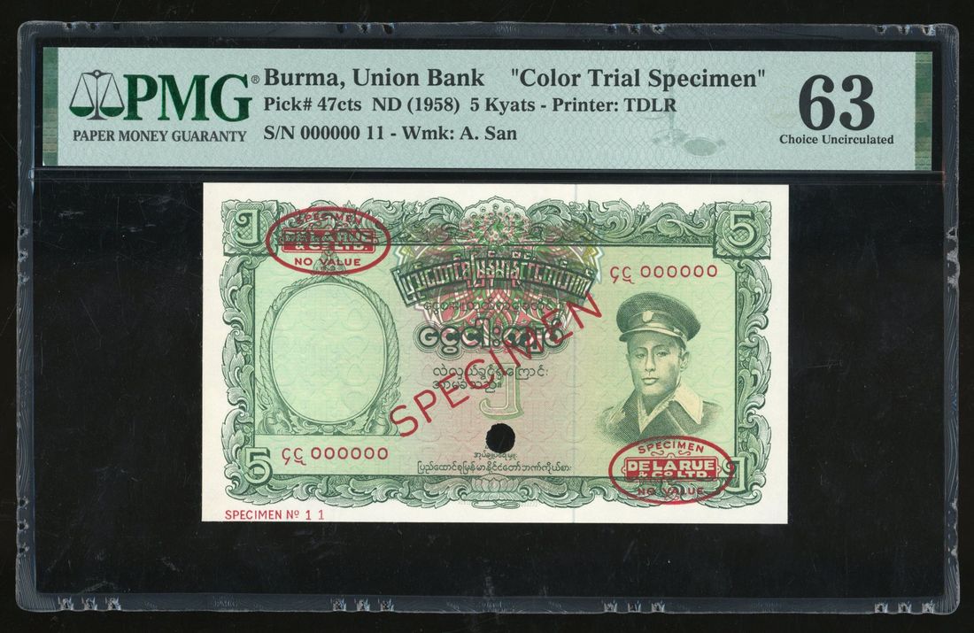 Union Bank of Burma, colour trial 5 kyats, ND (1958), serial number 000000, specimen number 11, green, issued note in brown,