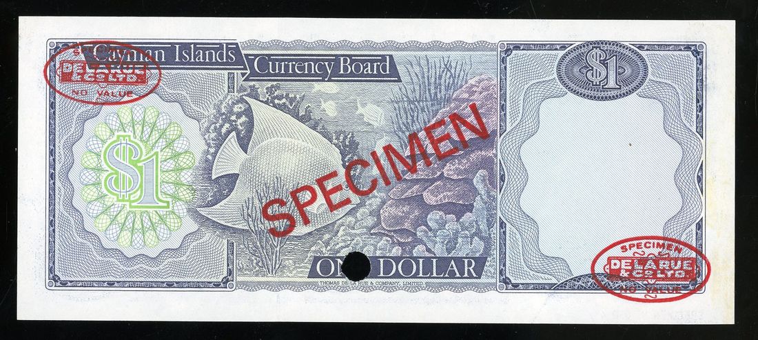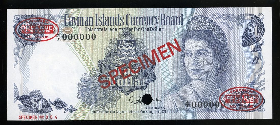 Cayman Islands Currency Board, specimen $1/2, L.1974, serial number A/3 00000 004, (Pick 5bs), mounting traces at reverse, about uncirculated. Specimens with DLR oval stamps scarcer