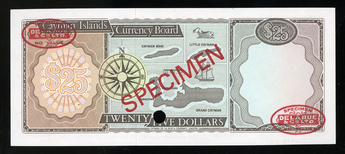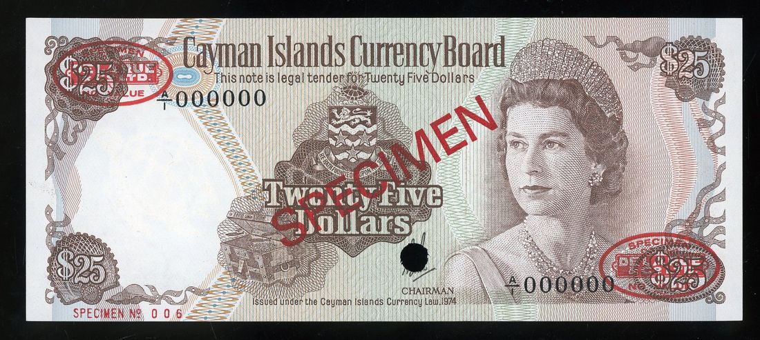 Cayman Islands Currency Board, specimen $25, L.1974, serial number A/1 00000 006, (Pick 8as), minor mounting traces at reverse, about uncirculated. Specimens with DLR oval stamps scarcer