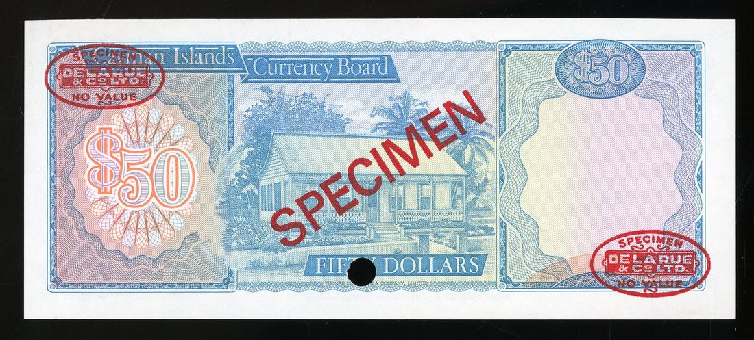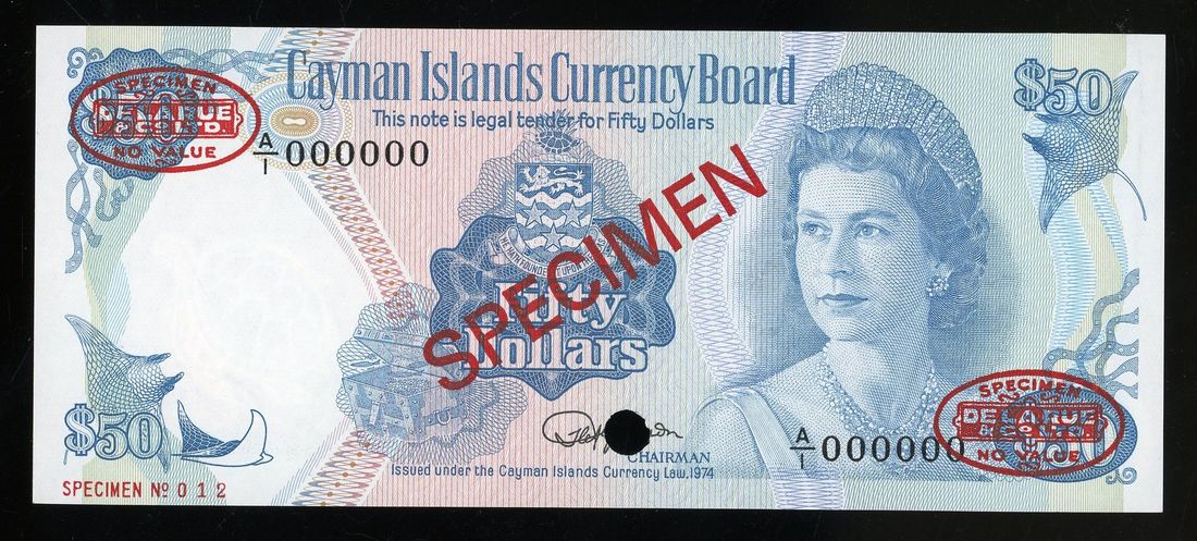 Cayman Islands Currency Board, specimen $50, L.1974, serial number A/1 00000 012, (Pick 10as), uncirculated. Specimens with DLR oval stamps scarcer.