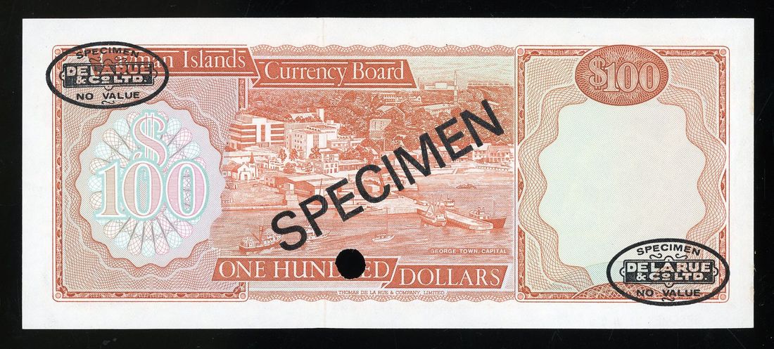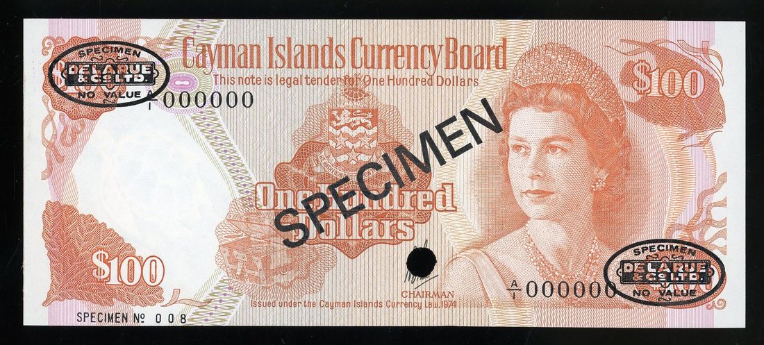 Cayman Islands Currency Board, specimen $100, L.1974, serial number A/1 00000 008, (Pick 11as), mounting traces at reverse, about uncirculated. Specimens with DLR oval stamps scarcer. One of the key type of the series