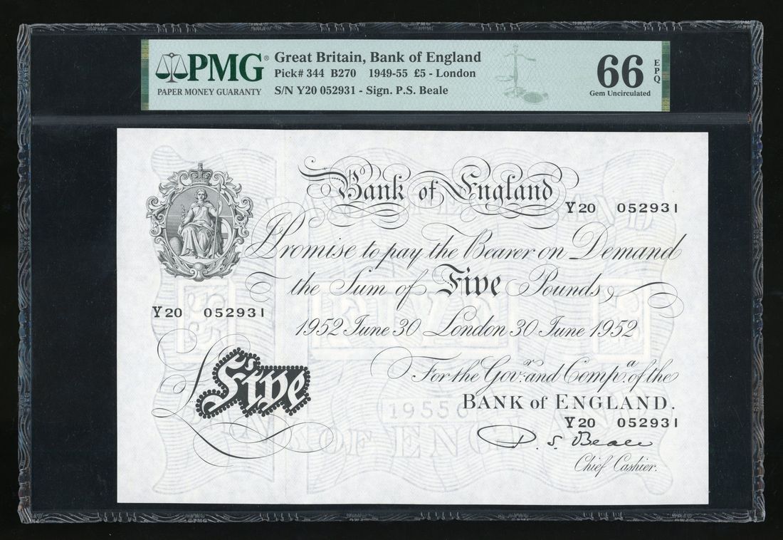 Bank of England, Great Britain, 5 pounds, 1949-55, serial number Y20 052931, (EPM B270, Pick 344),