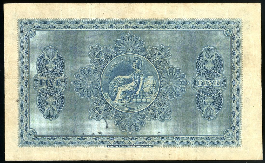The British Linen Bank, Scotland, £5, 1922, serial number P/4 20/47, blue on red underprint, arms at top, Britannia at left, two handsigned signatures,