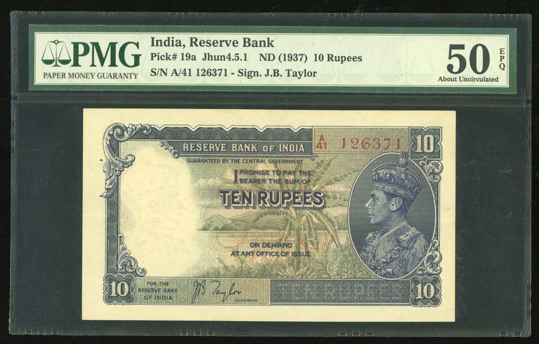 Reserve Bank of India, 10 Rupees, ND (1937), red serial number A/41 126371, George VI at right, Taylor signature, (Pick 19a, Jhun 4.5.1),