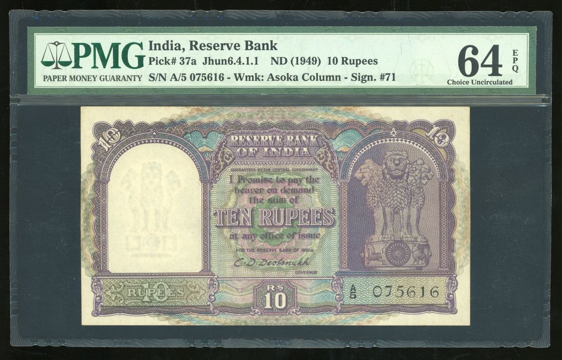 Reserve Bank of India, 10 rupees, ND (1949), serial numbers A/5 075616, purple, Ashoka column at right, Deshmukh signature, (Pick 37a, Razack-Jhunjhunwalla 6.4.1.1),