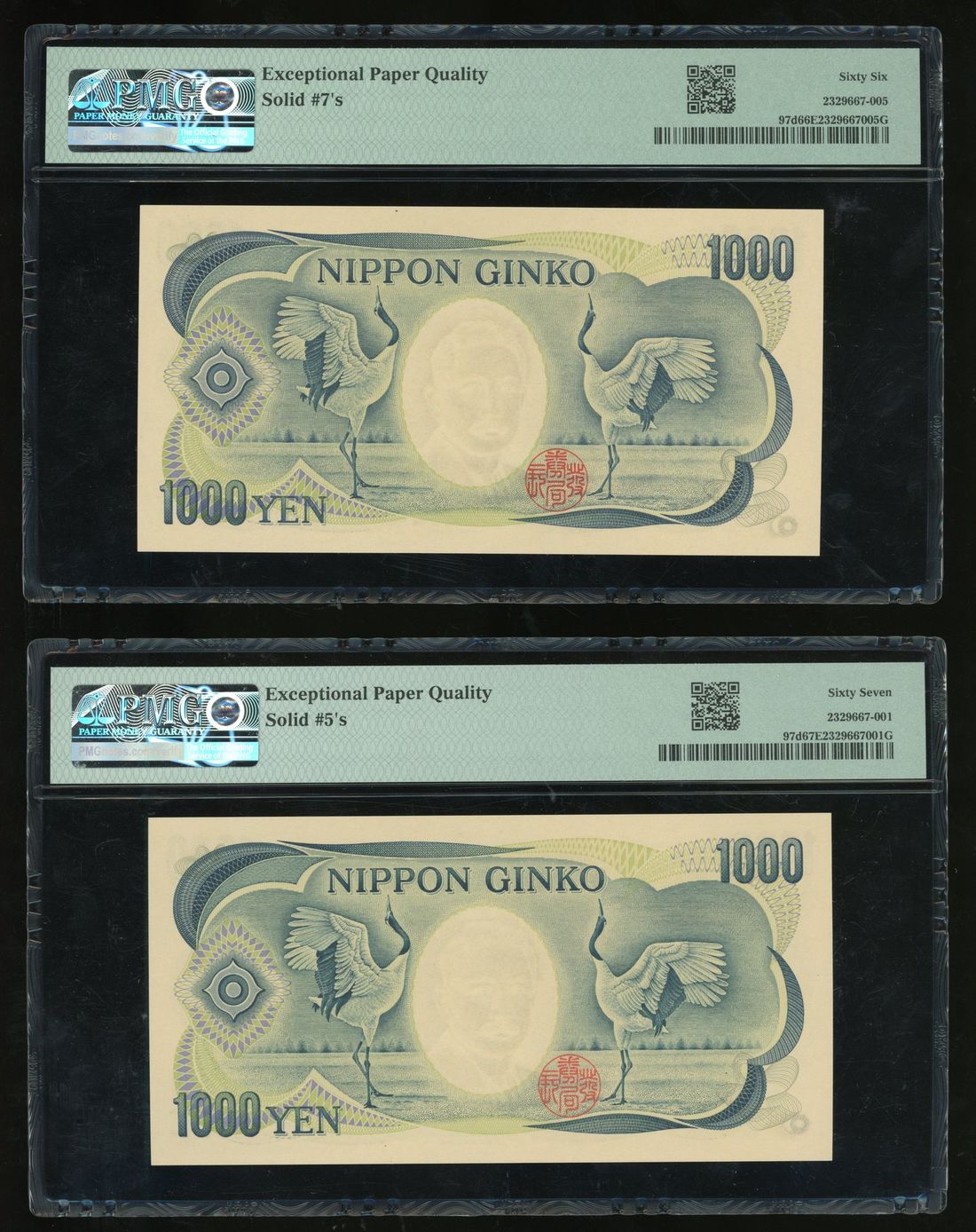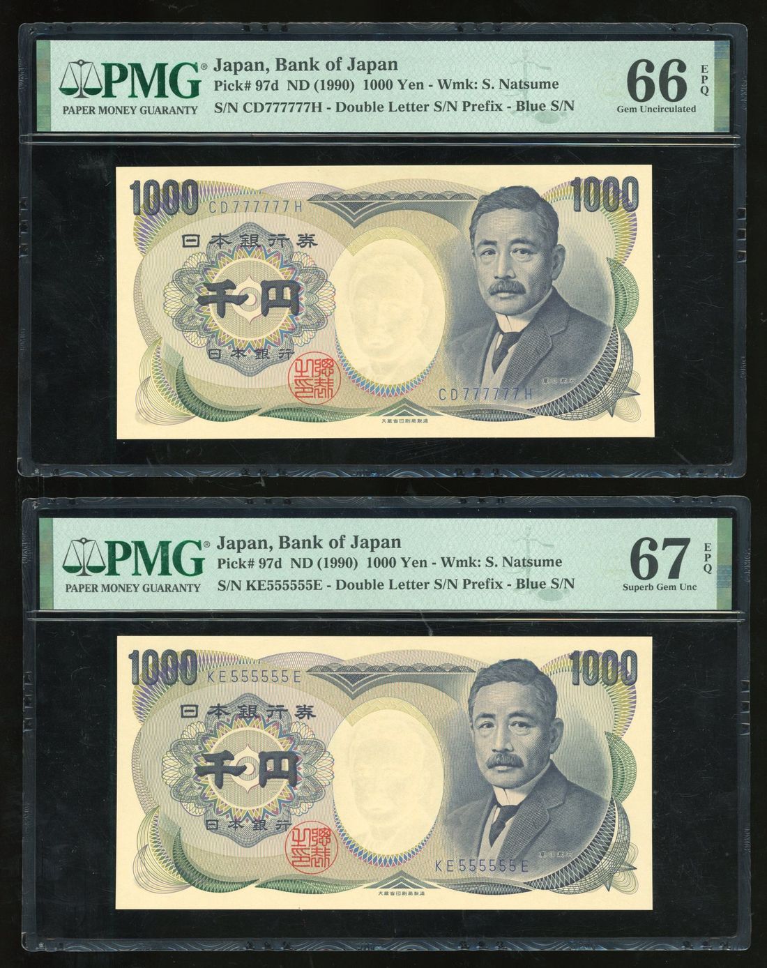Bank of Japan, 1000 yen (2), ND (1990), solid serial numbers KE555555E, CD777777H, (Pick 97d), PMG 67EPQ and 66EPQ respectively (2)
