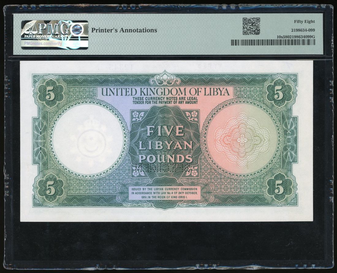 United Kingdom of Libya, specimen £5, ND (1955), serial numbers B/2 000001 - 300000, (Pick 10s), PMG 58, printer's annotations. Rare high denomination specimen. PMG Census one of only four