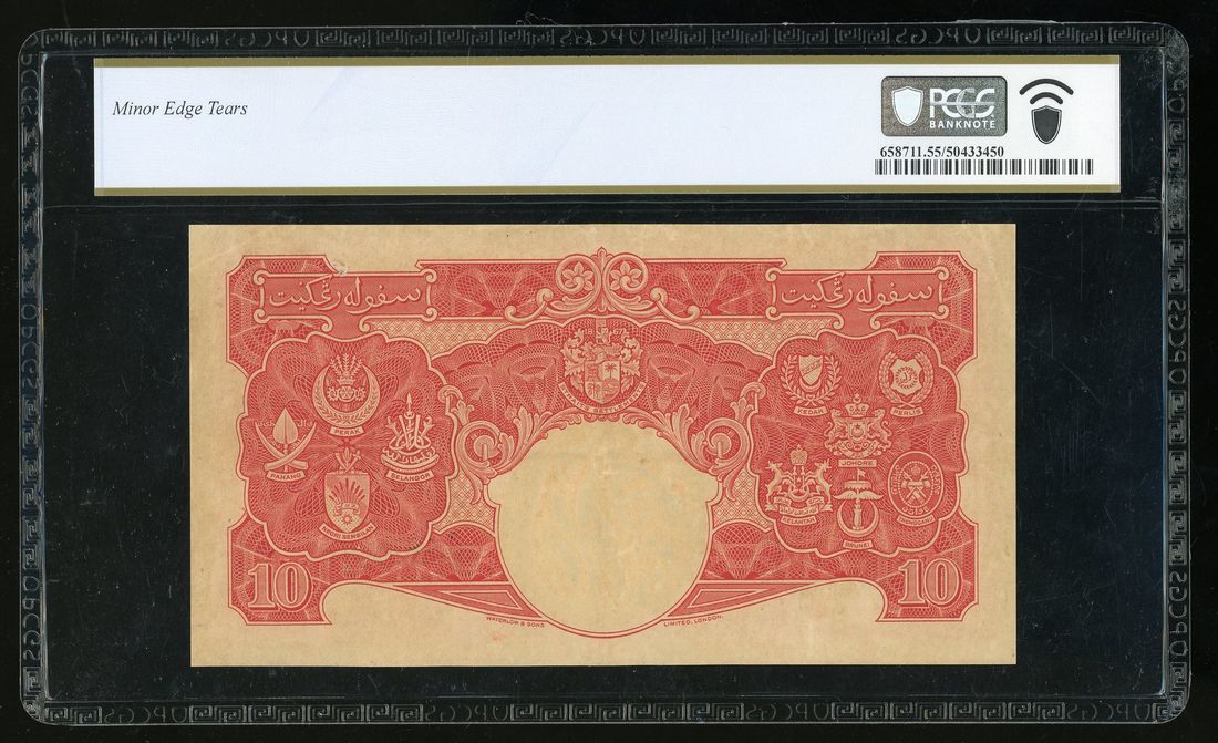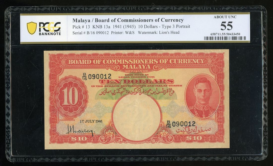 Board of Commissioners of Currency, Malaya, $10, 1941 (ND 1945), serial number B/16 090012, (Pick 13), PCGS 55, Minor Edge Tears
