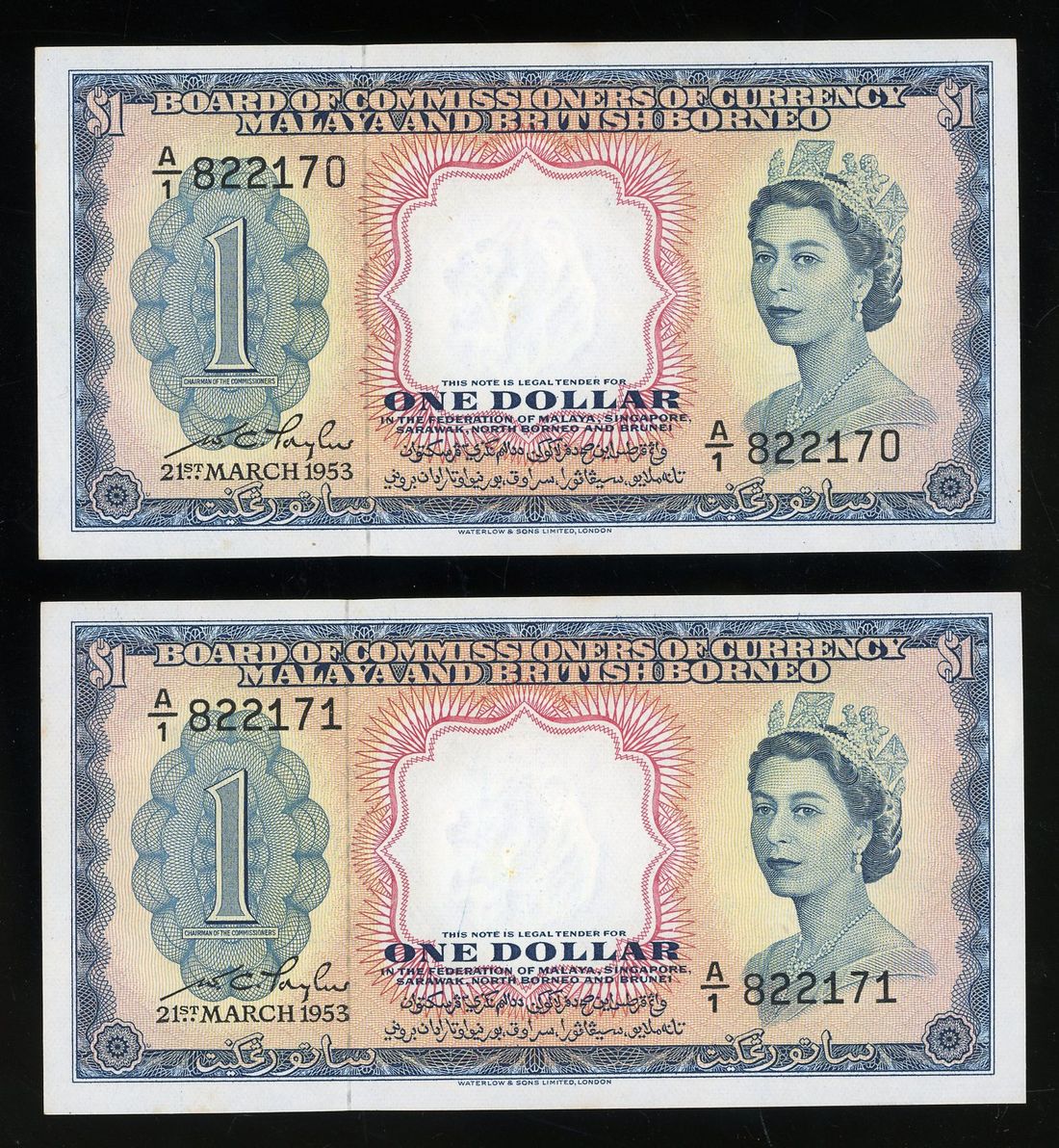 Malaya and British Borneo, consecutive pair $1, 21.3.1953, serial number A/1 822170-171, (Pick 1a), some light foxing at margins, about uncirculated (2)