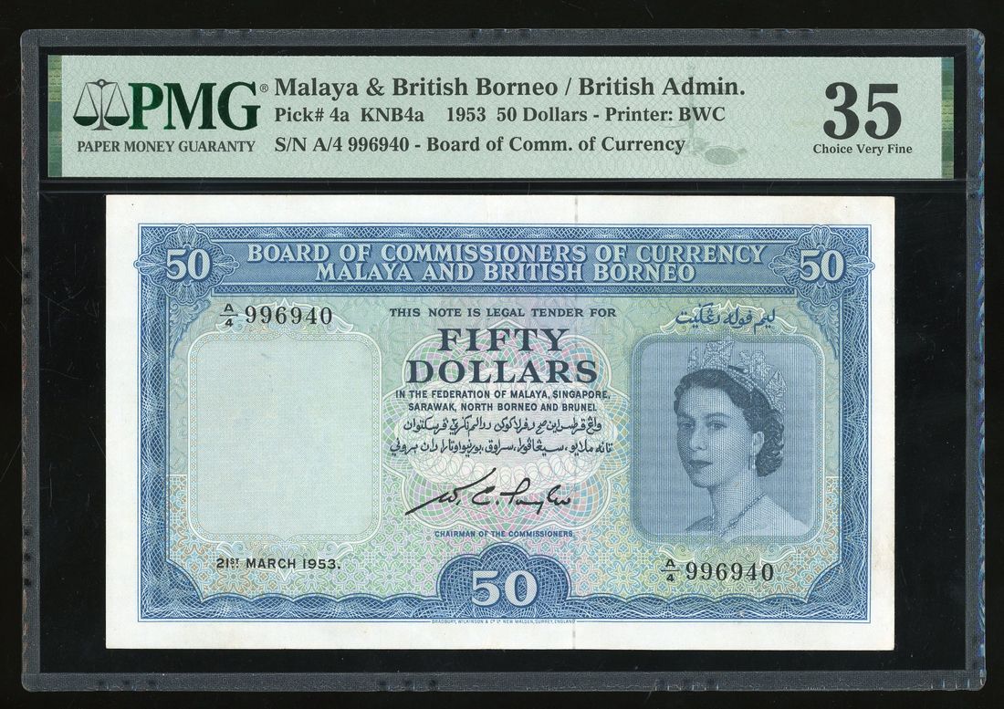 Malaya and British Borneo, $50, 21.3.1953, serial number A/4 996940, (Pick 4a), PMG 35