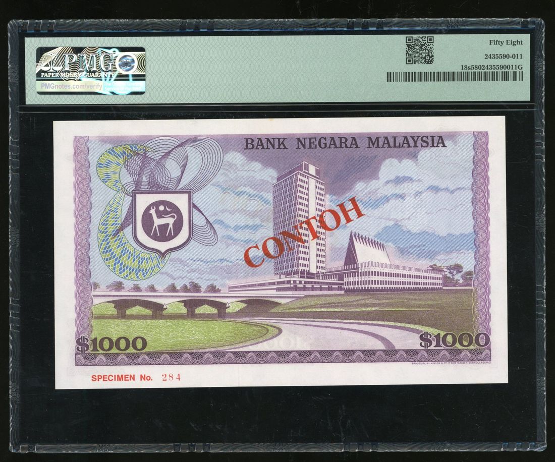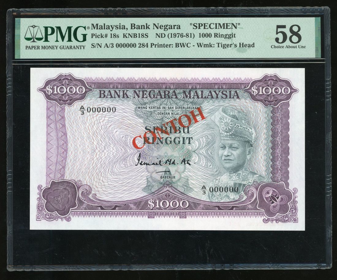 Bank Negara Malaysia, specimen 1000 ringgit, ND(1976-81), serial number A/3 000000, control number 284, red 'CONTOH' overprinted on both sides,