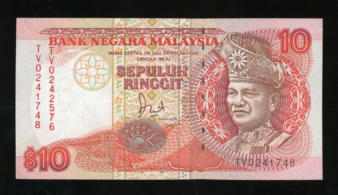 Bank Negara Malaysia, ERROR 10 ringgit, ND (1989), serial number TV0241748 / TV0242576, additional different serial number at left,