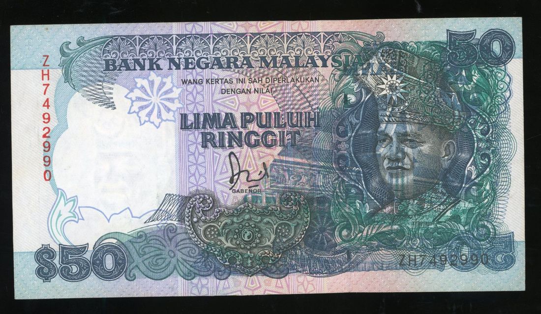 Bank Negara Malaysia, ERROR 50 ringgit, ND (1987), serial number ZH7492990, wet ink error with reverse design printed on obverse over portrait,