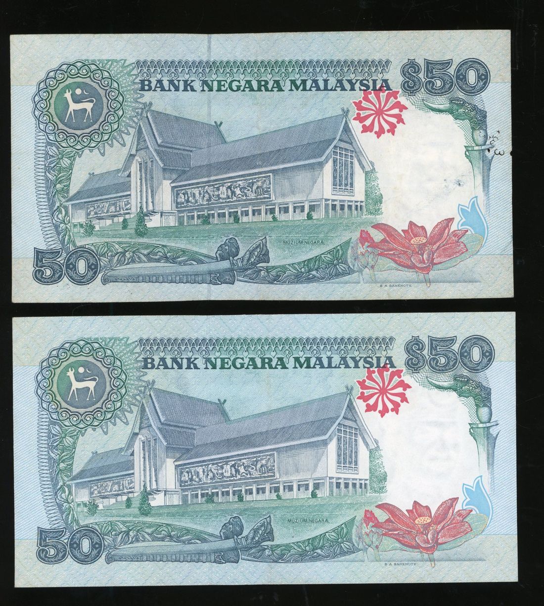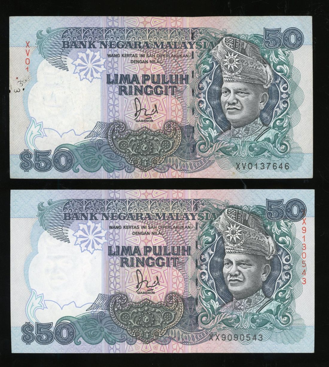 Bank Negara Malaysia, ERROR 50 ringgit (2), ND (1987, 1991), serial number XV0137646, XX9090543/XX9130543, both with serial number errors, one with one set of partially missing serial number, the other with mismatched serial number moved to the right,