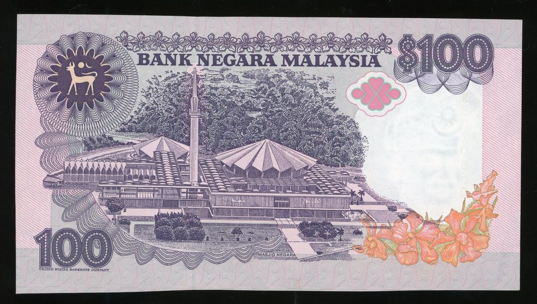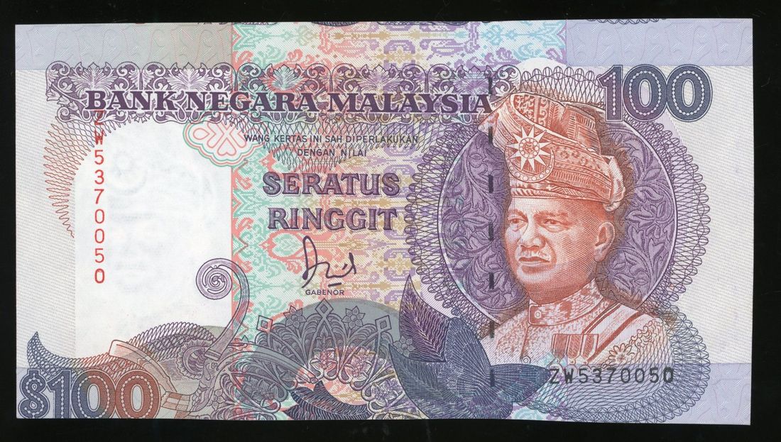 Bank Negara Malaysia, ERROR 100 ringgit, ND (1992), serial number ZW5370050, misaligned printing error with part of another note's design shown,