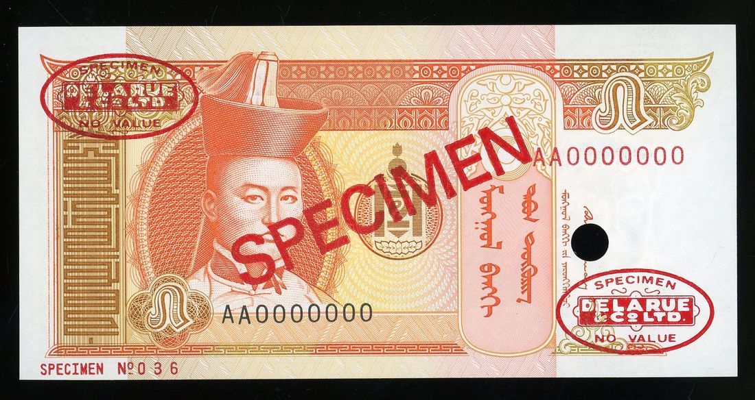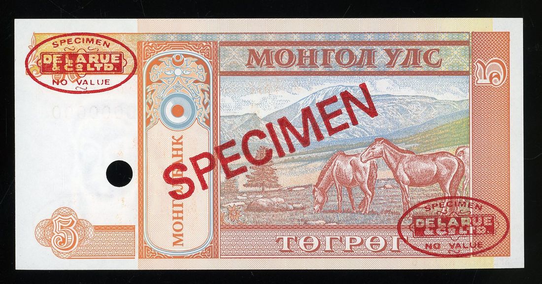 Mongolia, specimen 5 togrog, ND (1993), serial number AA0000000, (Pick 53s), uncirculated. With DLR oval stamps.