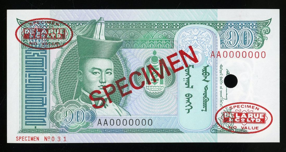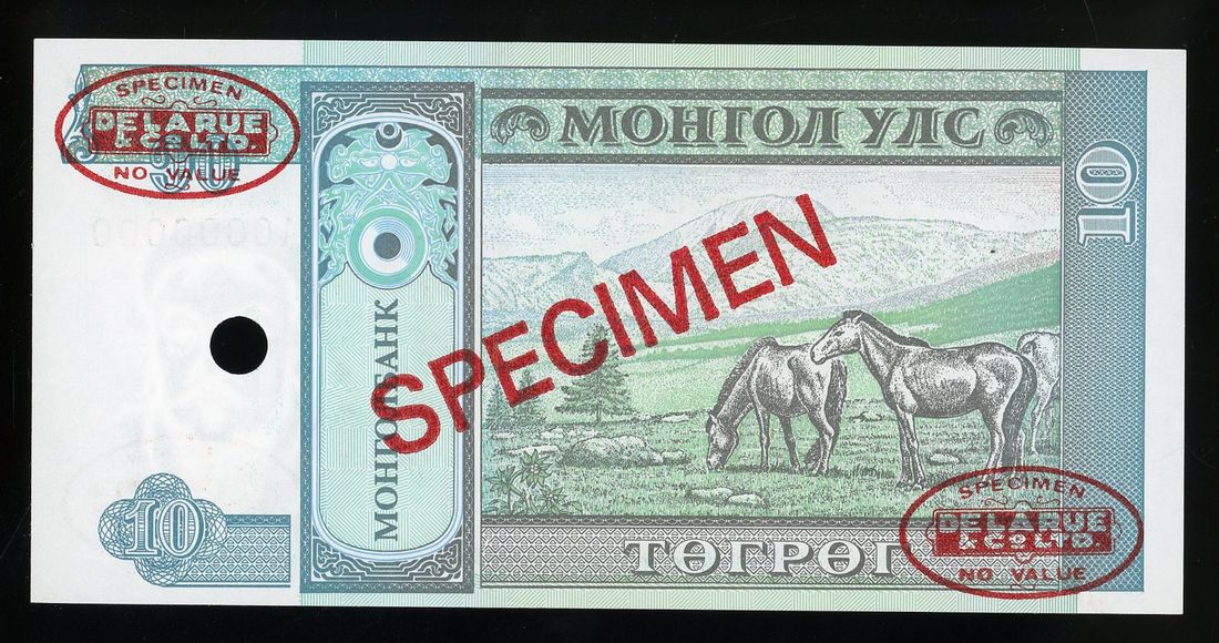 Mongolia, specimen 10 togrog, ND (1993), serial number AA0000000, (Pick 54s), uncirculated. With DLR oval stamps.