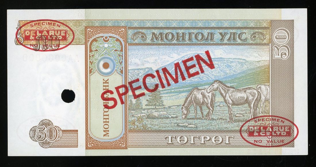Mongolia, specimen 50 togrog, ND (1993), serial number AA0000000, (Pick 56s), uncirculated. With DLR oval stamps.