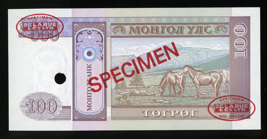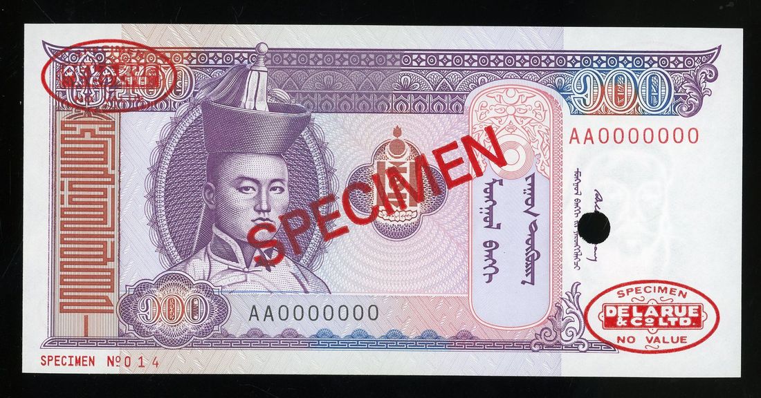 Mongolia, specimen 100 togrog, ND (1993), serial number AA0000000, (Pick 57s), uncirculated. With DLR oval stamps.