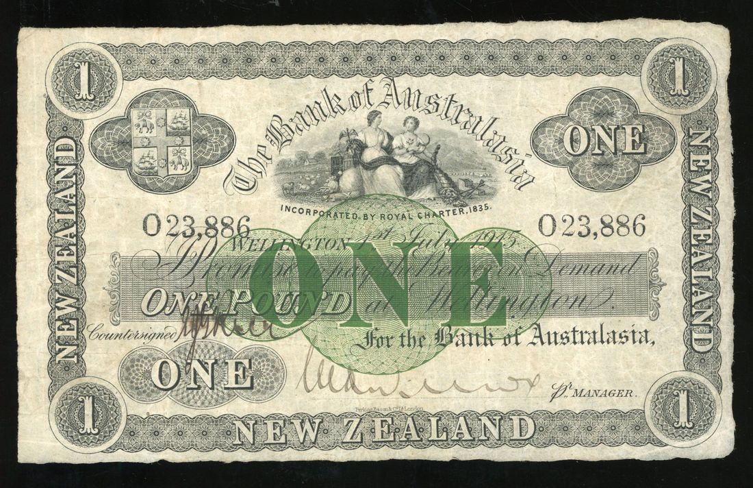 Bank of Australasia, New Zealand, £1, Wellington, 1.7.1915, serial number O 23886, (Pick S117m), fine. Issued notes scarce