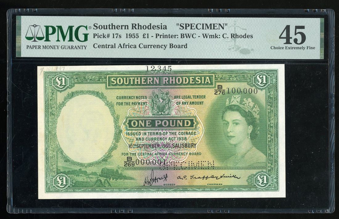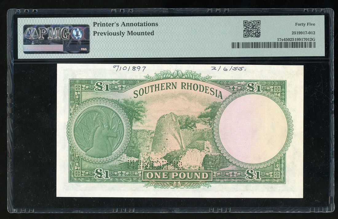 Southern Rhodesia, specimen £1, 10.9.1955, serial number range B/269 000,001 - B/276 100,000, (Pick 17s), PMG 45, printer's annotations, previously mounted. Quite rare