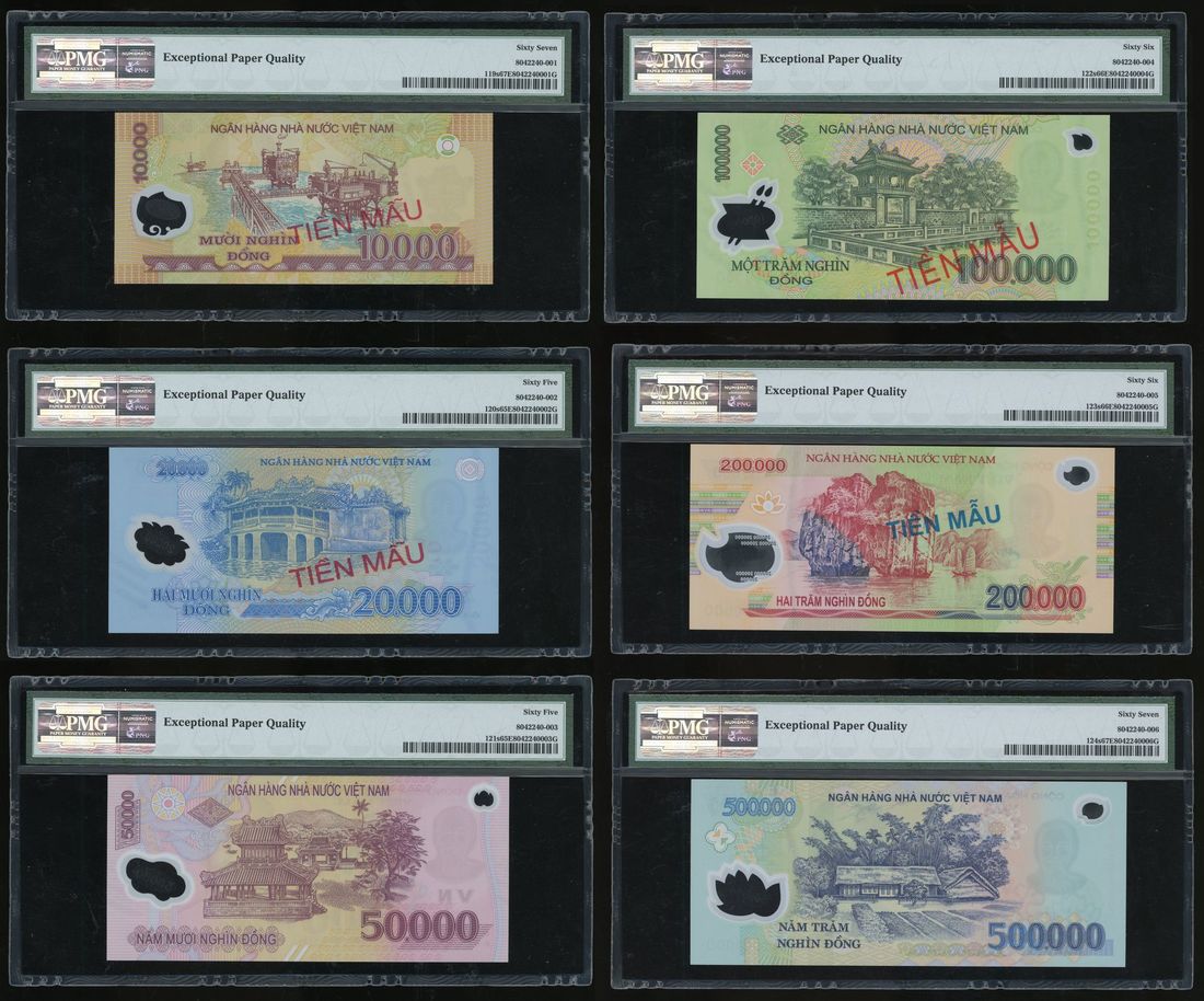 State Bank of Vietnam, a set of 6 specimens, 10000, 20000, 50000, 100000, 200000 and 500000 dong, 2003-2011, orange, blue, red, green and red respectively, Ho Chi Minh and Arms on obverse, overprinted with 'SPECIMEN',