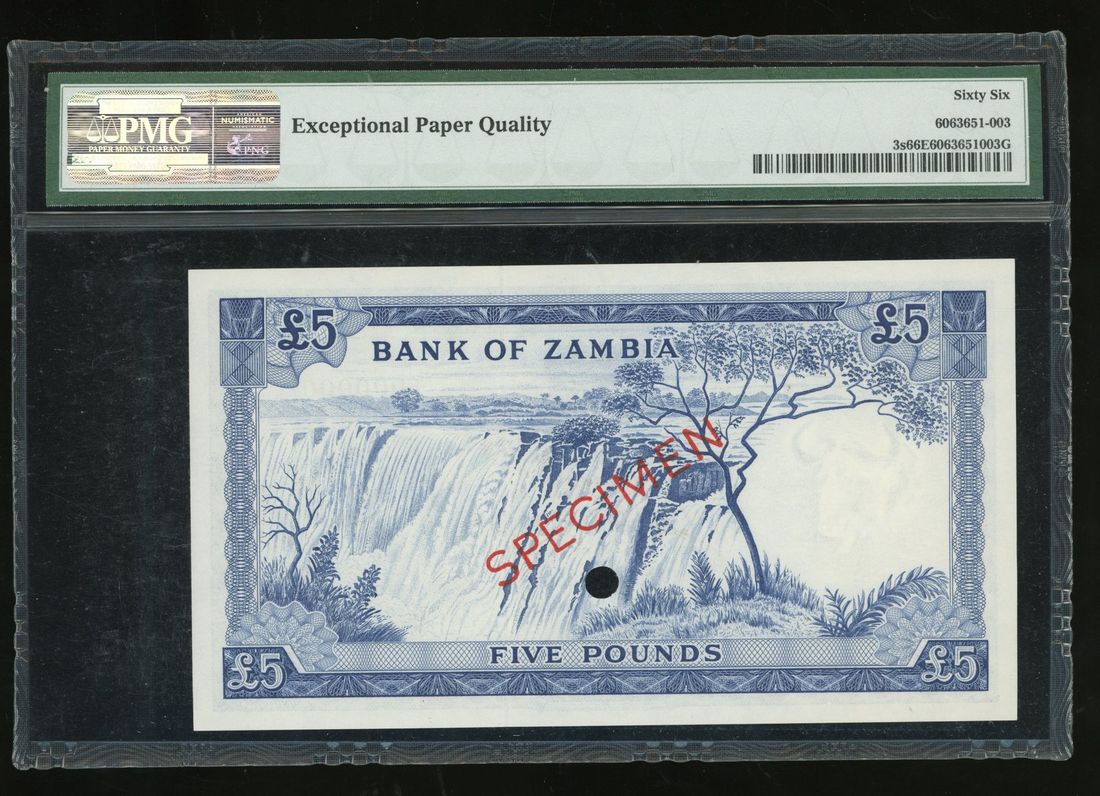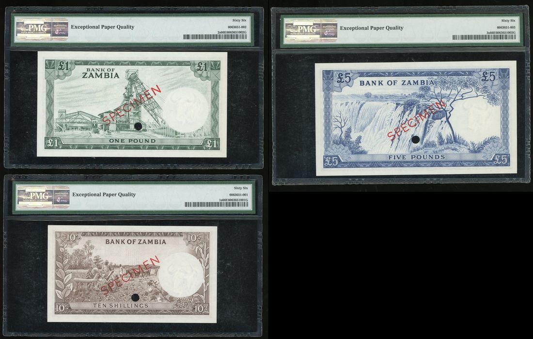 Bank of Zambia, a set of specimens ND (1964), prefixes A/1, B/1, C/1, zero serial numbers, (Pick 1s-3s), all PMG 66EPQ (3). Zambia's first series of issued banknotes after its independence. 10/- PMG TOP POP (3)
