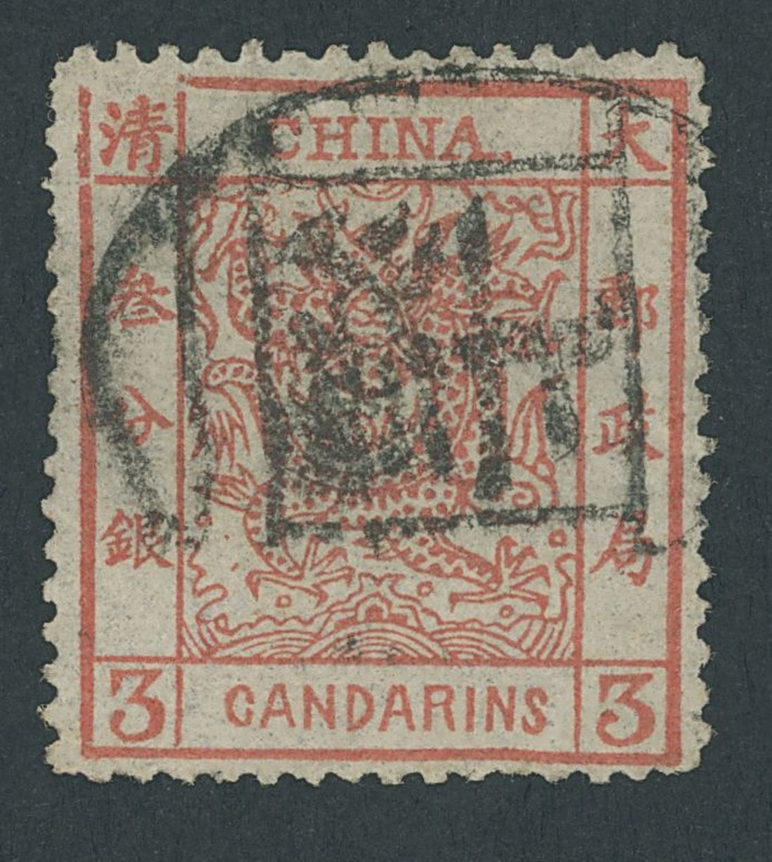 3ca. vermilion [22] after setting II showing broken N.W. corner, cancelled by Shanghai seal in black; a couple of slightly short perfs. and corner crease. Photo