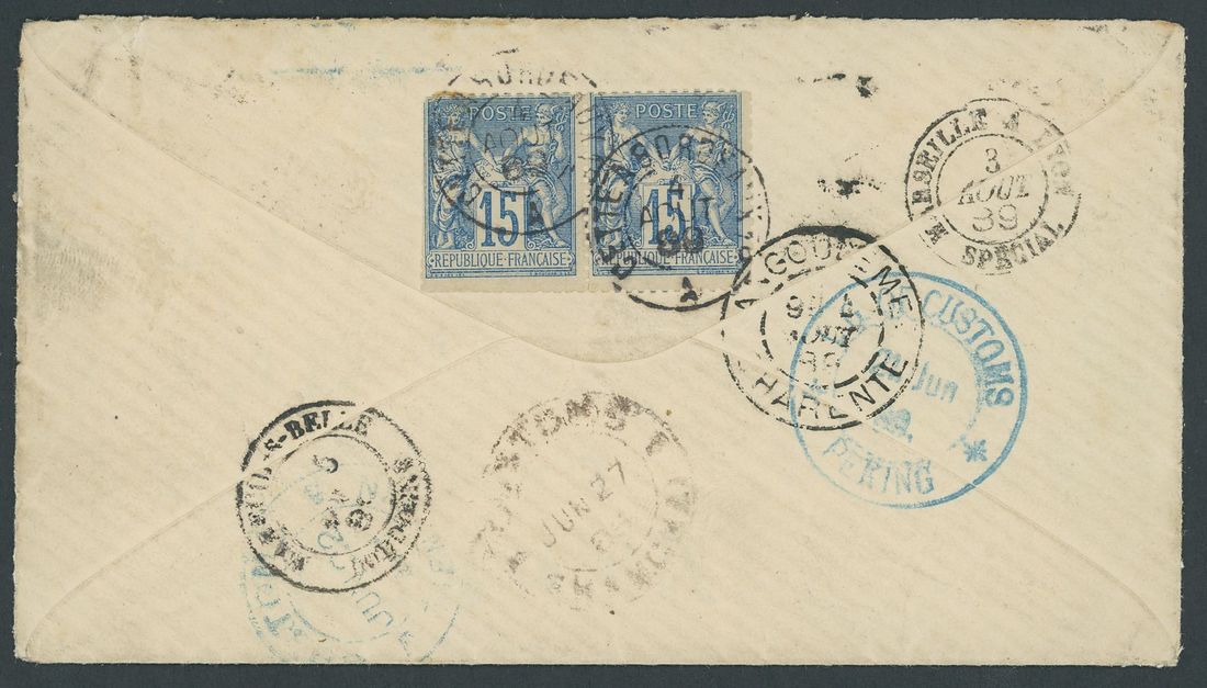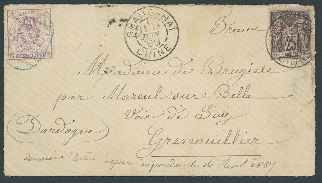 1889 (22 June) opened-out envelope to France bearing perf.11½ 3ca. tied by Peking seal in blue with France 25c. tied by "