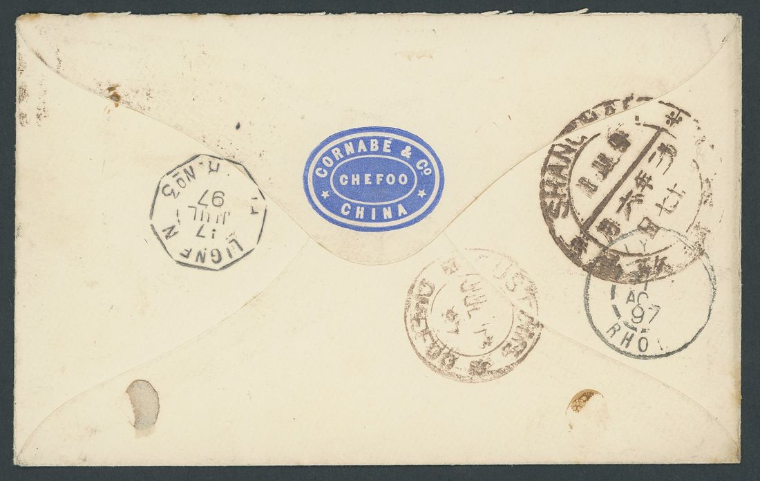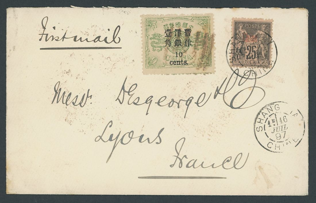 1897 (13 July) envelope to France by "First mail" bearing 10c. on 9ca. dull green cancelled by Chefoo pa-kua with French "Chine" 25c. tied by "