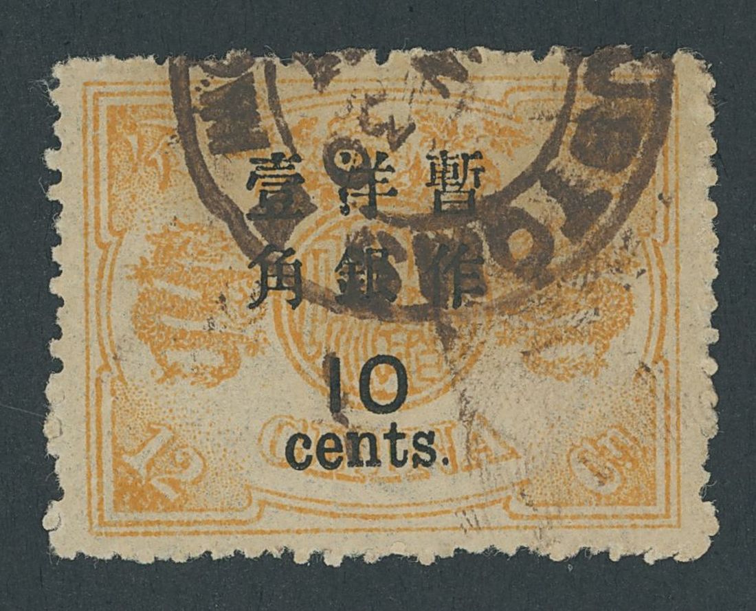 10c. on 12ca. 'Golden Dragon' cancelled by Customs Soochow c.d.s. dated 1897 (30 June), a good example from pane 9 ('c' of 'cents' over "C" of 'CHINA'). Photo