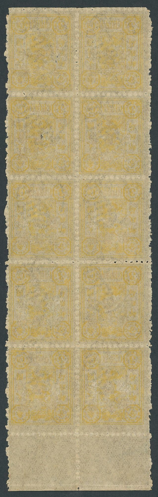 3ca. pale chrome variety without surcharge, in a top margin block of ten, large part original gum with the typical gum streaking on this value. A desirable multiple, only two blocks of twelve recorded, this is the only block of ten. Chan 74b. Photo