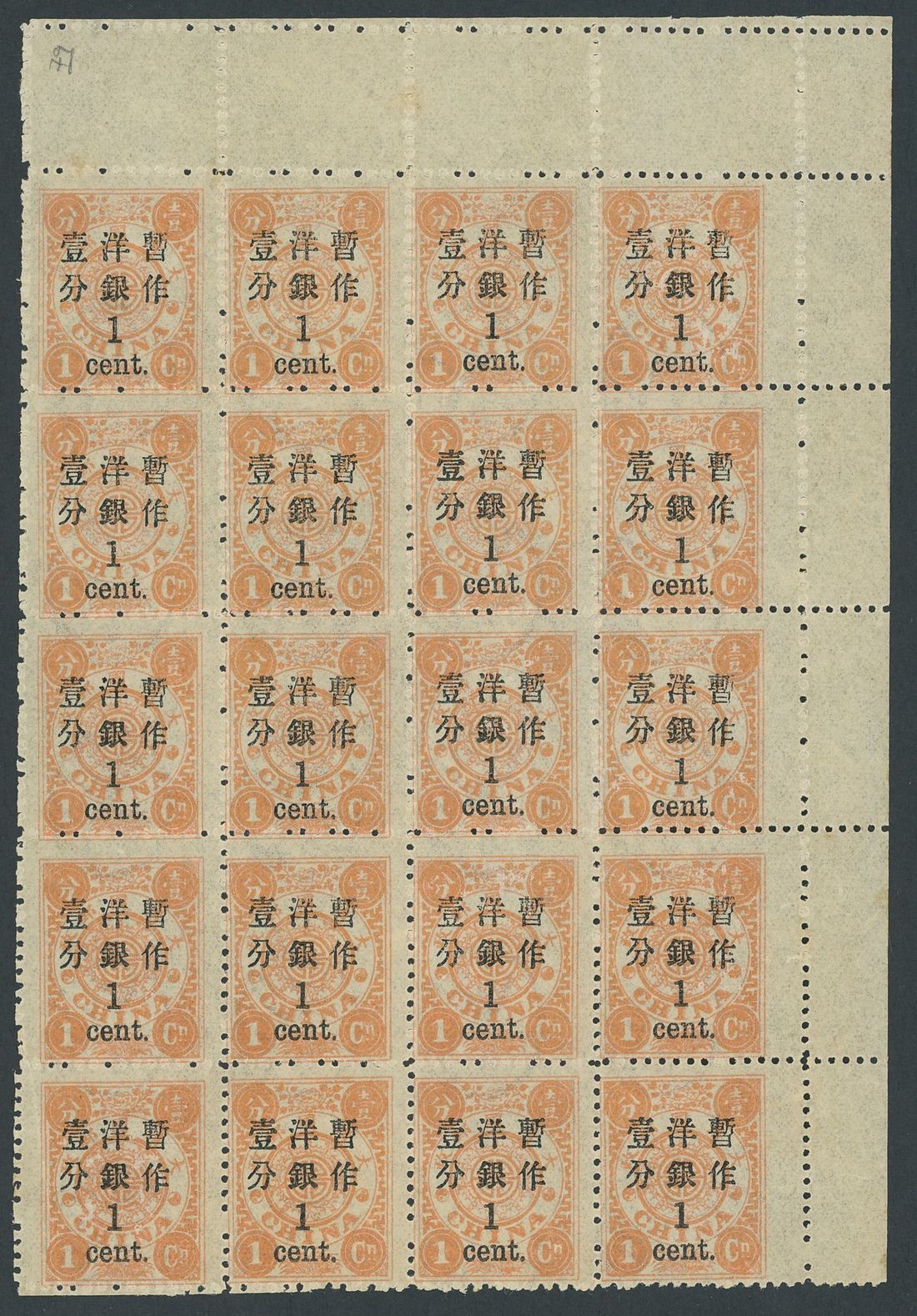 1c. on 1ca. salmon-red in a pane of twenty, pane IV, with sheet margins on two sides, apparently unmounted mint. Shows very wide margin at right. A good block. Watermark inverted. Photo