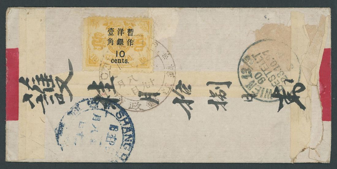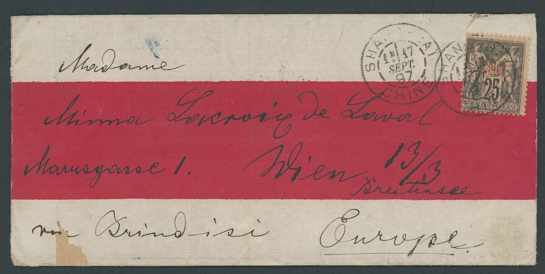1897 (15 Sept.) red band envelope to Vienna "via Brindisi" bearing, on the reverse, Wide Setting on second print 10c. on 12ca. orange-yellow (defect at foot) tied by Chinkiang Dollar dater, with Shanghai Dollar dater in dark blue (18.9, reversed "S") and Vienna arrival (23.10), the address side with France "chine" 25c. tied by "