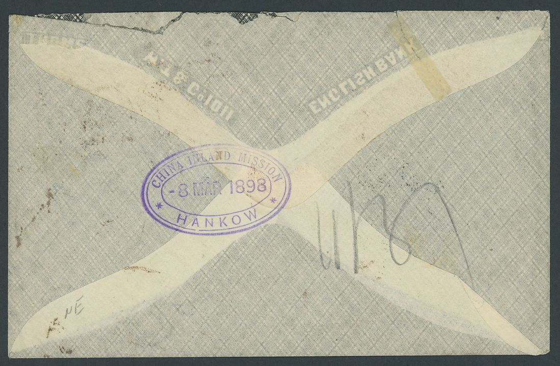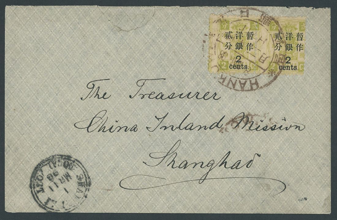 1898 (8 Mar.) envelope from the China Inland Mission in Hankow to their office in Shanghai bearing pair of Wide Setting, second print 2c. on 2ca. dull yellow-green tied by Hankow Dollar dater with Shanghai Local Post (11 Mar.) c.d.s. in lower corner. Photo