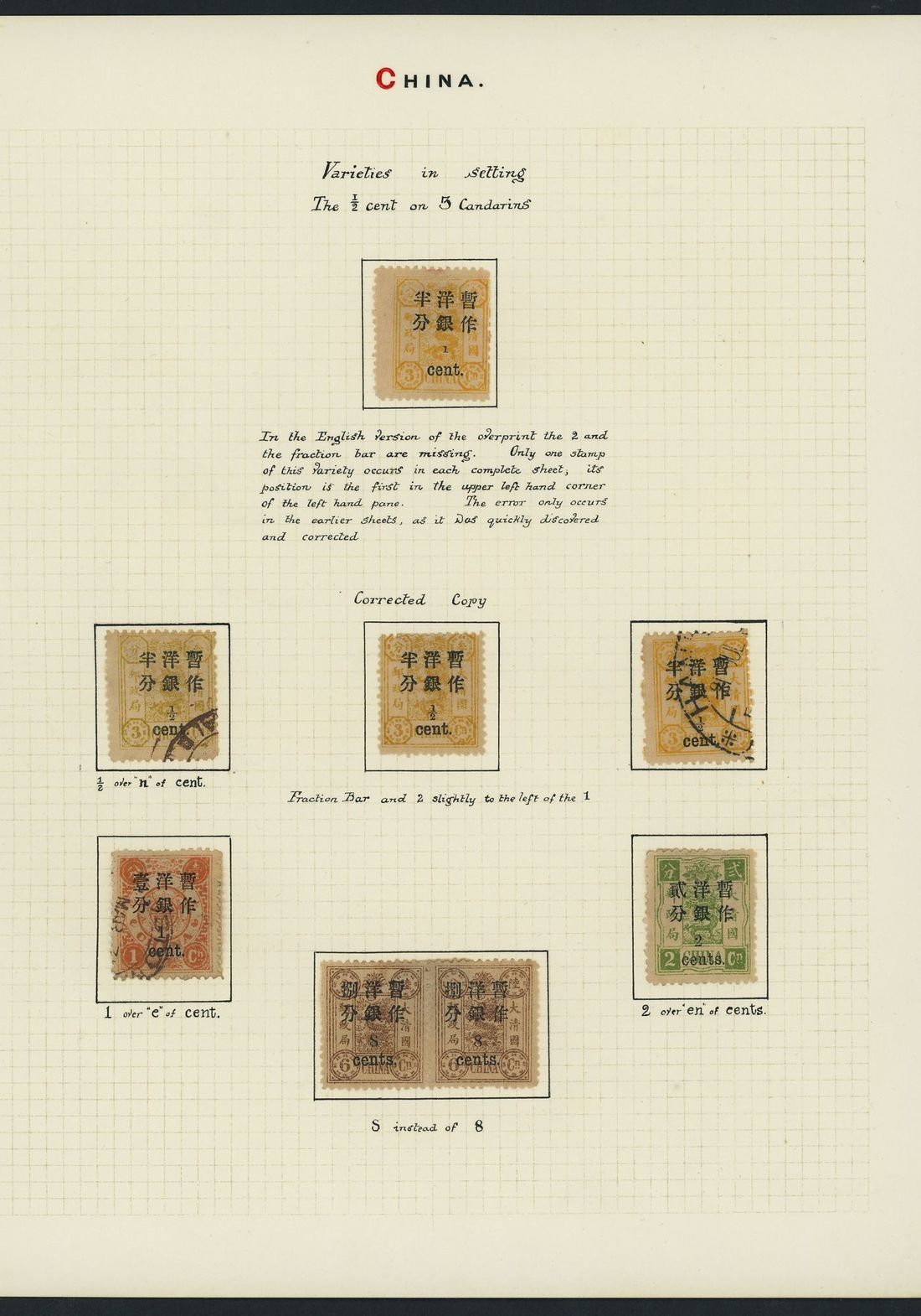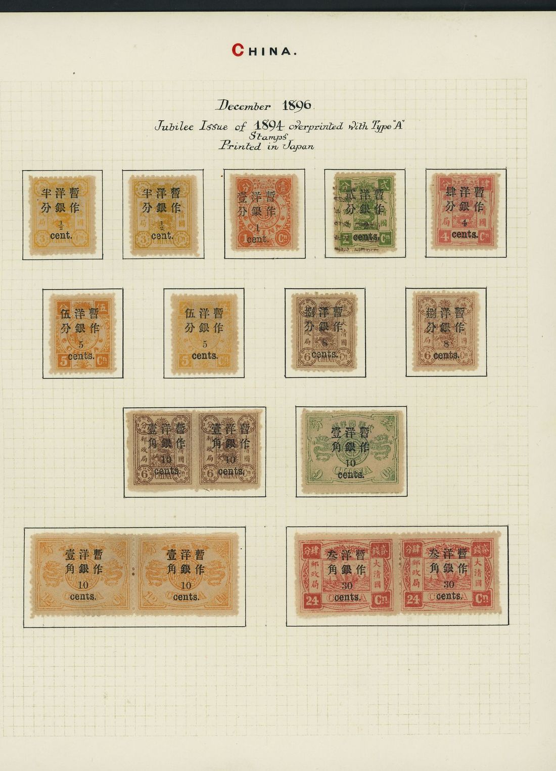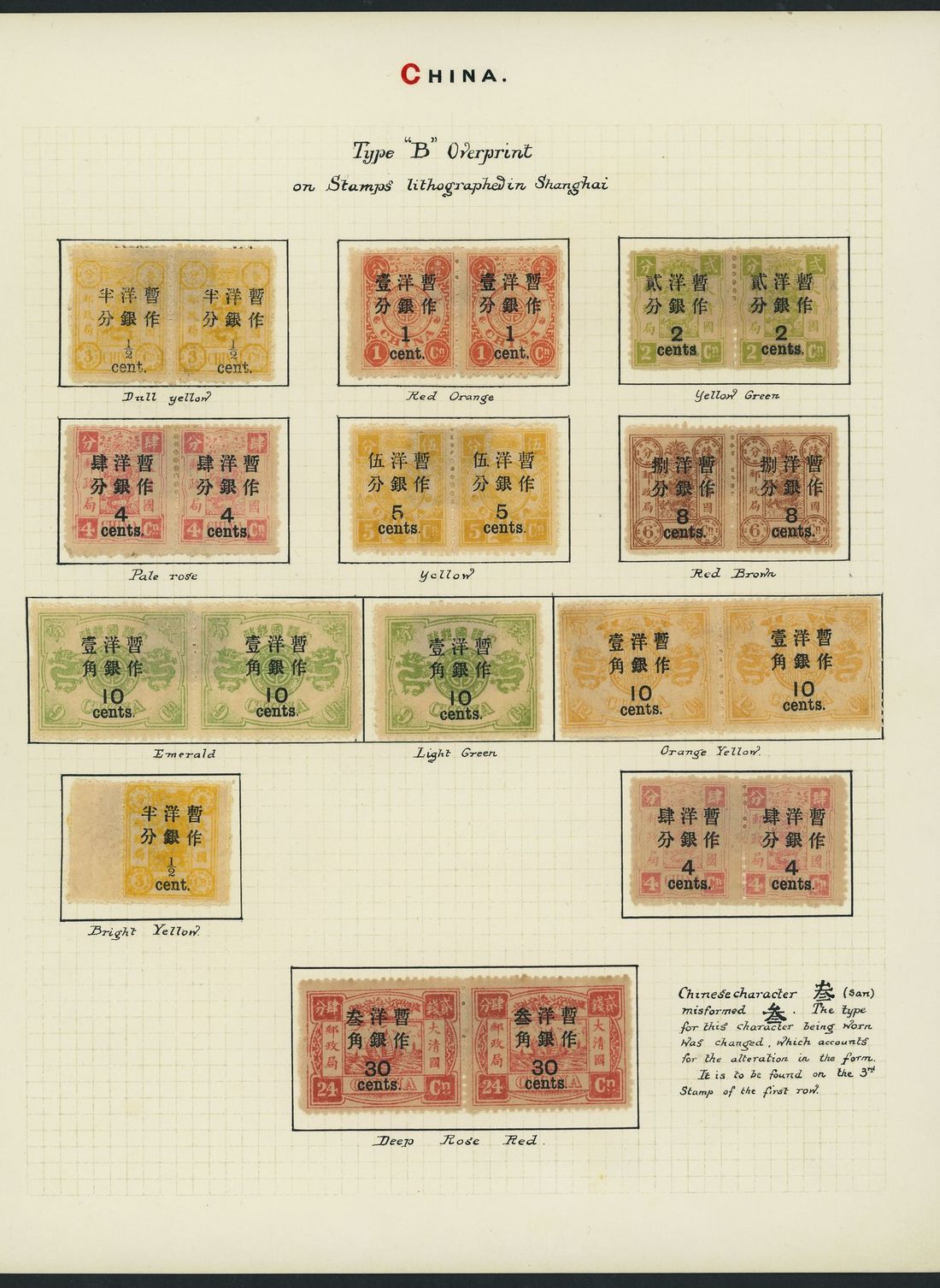 A very fine and attractive collection on leaves with Small Figures on Small Dragon set in pair (2c. on 3ca.) or blocks of four; Small Figures set of ten with some shades and the top two values in horizontal pairs plus some positional varieties including "1" for "½"; Large Figures, Wide Setting on first printing values to 10c. on 9ca. plus second printing set in horizontal pairs, one 30c. on 24ca. with variety of "3" type A, also cracked dot of yang type C (4c. on 4ca), broken slanting stroke of gin (10c. on 9ca.); Narrow Setting on Small Dragon set of three; first print values to 8c. on 6ca., 10c. on 9ca. and 10c. on 12ca. with 2c. on 2ca., the 'Emerald Lady' used with blue pa-kua and includes broken slanting dot of gin at left and cracked dot of yang on 1c. on 1ca. (pane 2 [17-18]), broken foot of kun on 4c. on 4ca.; redrawn stamps in horizontal pairs. Some stamps have been heavily mounted but the condition is generally good to fine. An exceptional lot well written up. Ex Valentine Burkhardt. (88). Photo