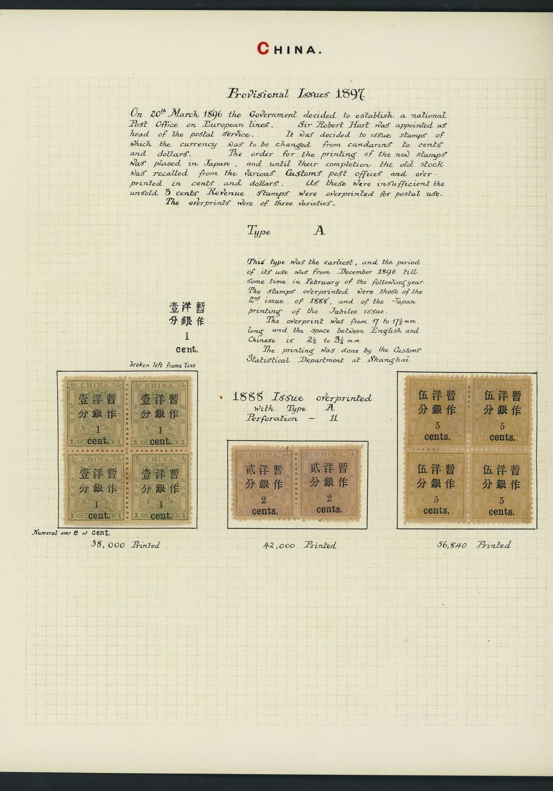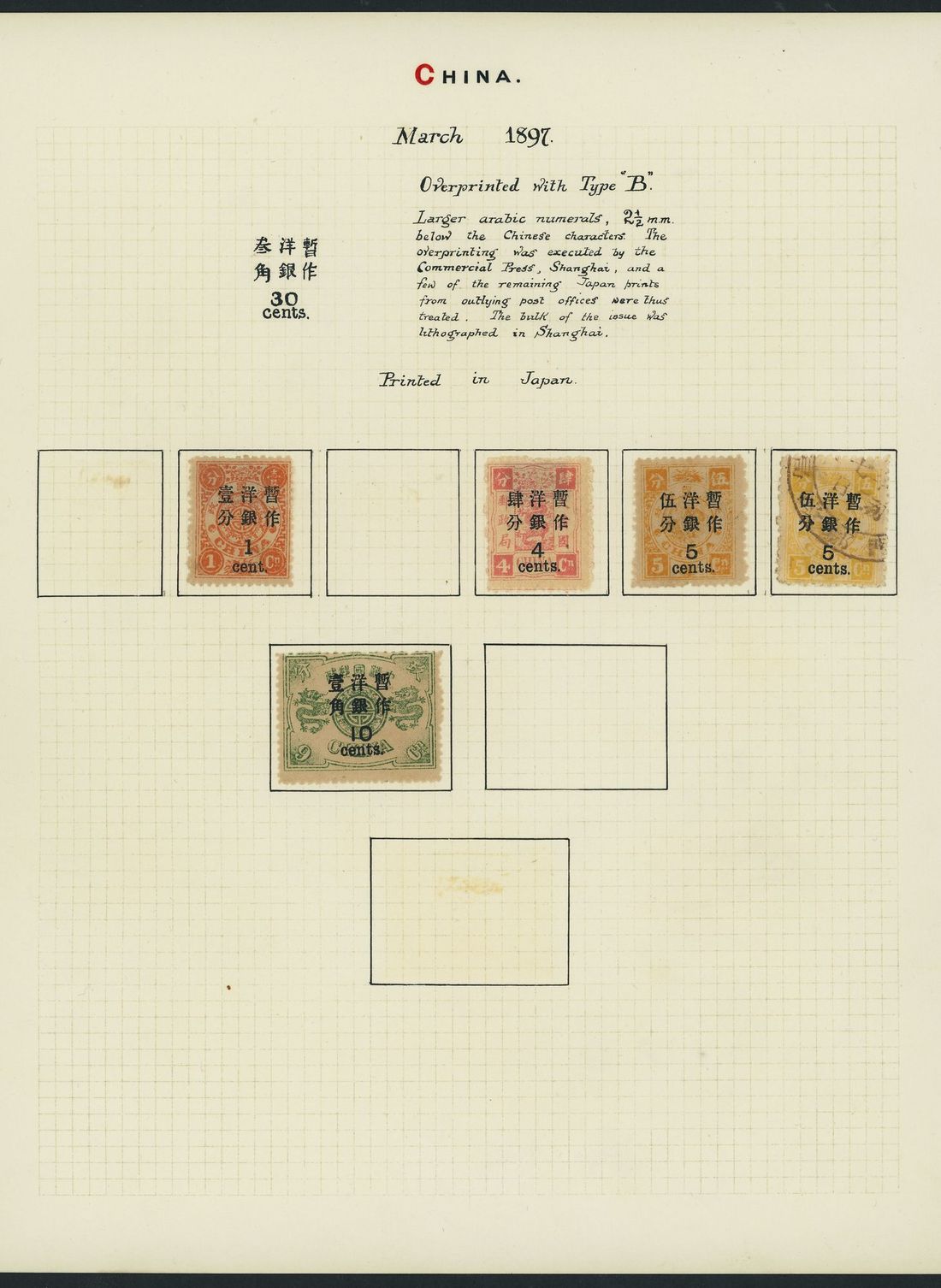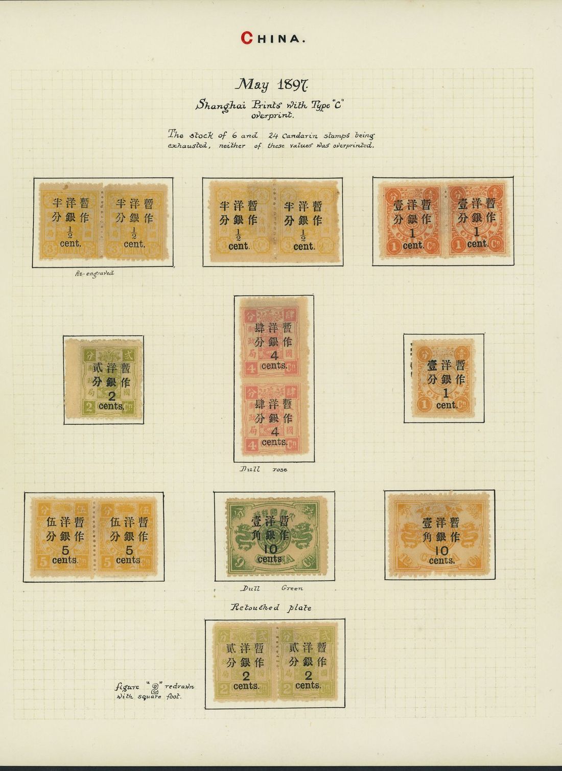 A very fine and attractive collection on leaves with Small Figures on Small Dragon set in pair (2c. on 3ca.) or blocks of four; Small Figures set of ten with some shades and the top two values in horizontal pairs plus some positional varieties including "1" for "½"; Large Figures, Wide Setting on first printing values to 10c. on 9ca. plus second printing set in horizontal pairs, one 30c. on 24ca. with variety of "3" type A, also cracked dot of yang type C (4c. on 4ca), broken slanting stroke of gin (10c. on 9ca.); Narrow Setting on Small Dragon set of three; first print values to 8c. on 6ca., 10c. on 9ca. and 10c. on 12ca. with 2c. on 2ca., the 'Emerald Lady' used with blue pa-kua and includes broken slanting dot of gin at left and cracked dot of yang on 1c. on 1ca. (pane 2 [17-18]), broken foot of kun on 4c. on 4ca.; redrawn stamps in horizontal pairs. Some stamps have been heavily mounted but the condition is generally good to fine. An exceptional lot well written up. Ex Valentine Burkhardt. (88). Photo