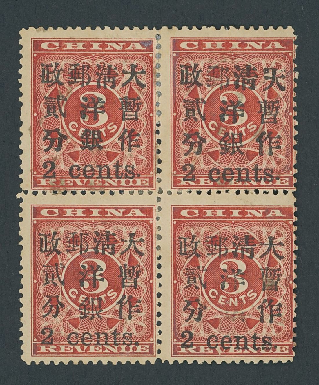 Small Figures: 2c. on 3c. red in a block of four from an unknown setting [9-6/5-20], [20] shows some weakness of the characters with the centre character from the lower row virtually missing, part original gum; a few split and reinforced perforations. An intriguing block which is ideal for further specialist study and discussion. Photo
